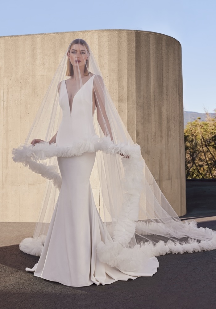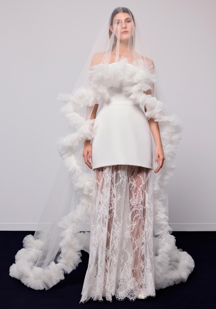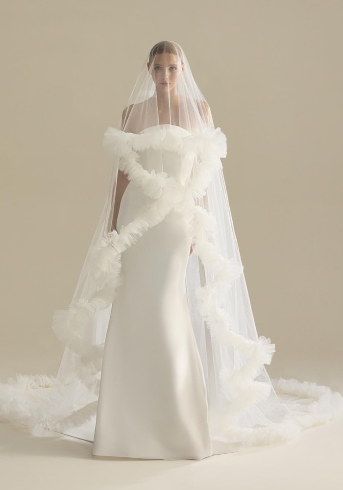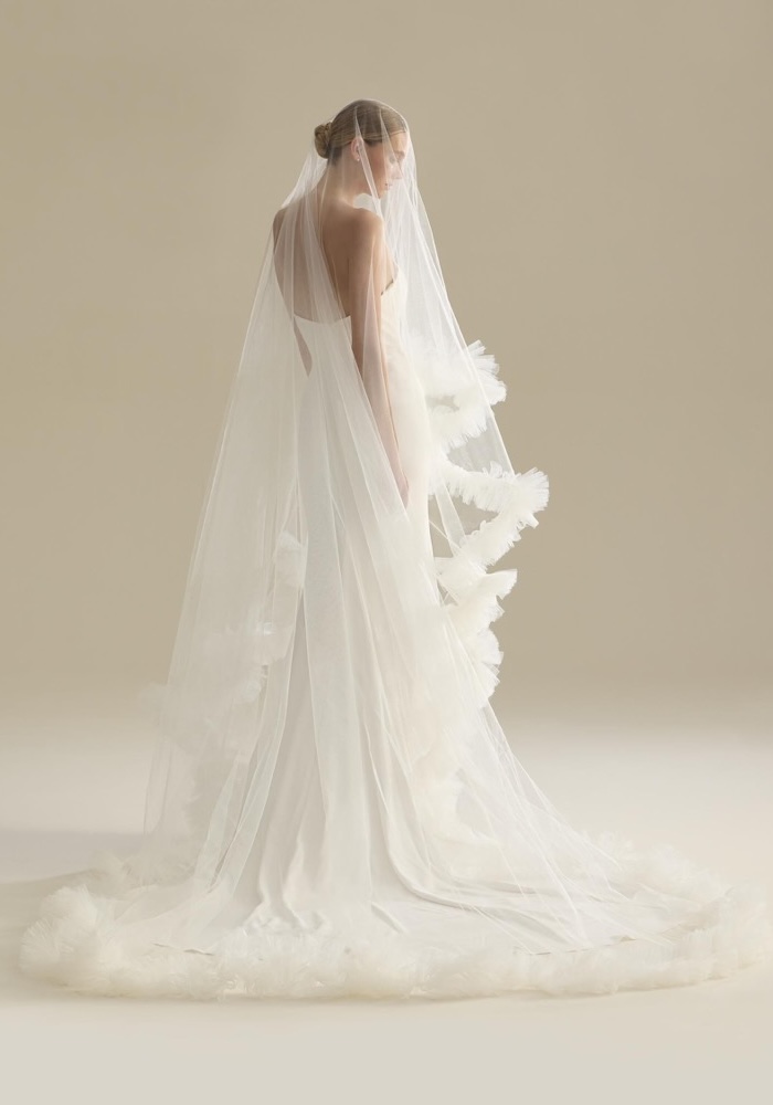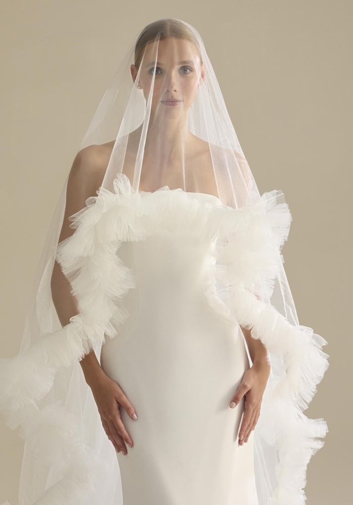 Long wedding veil in tulle adorned with dramatic small ruffles.