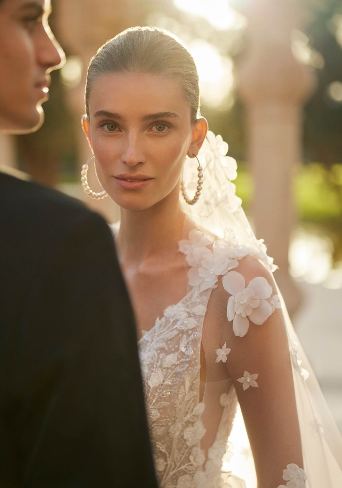Long wedding veil in tulle adorned with intricate 3D flowers.