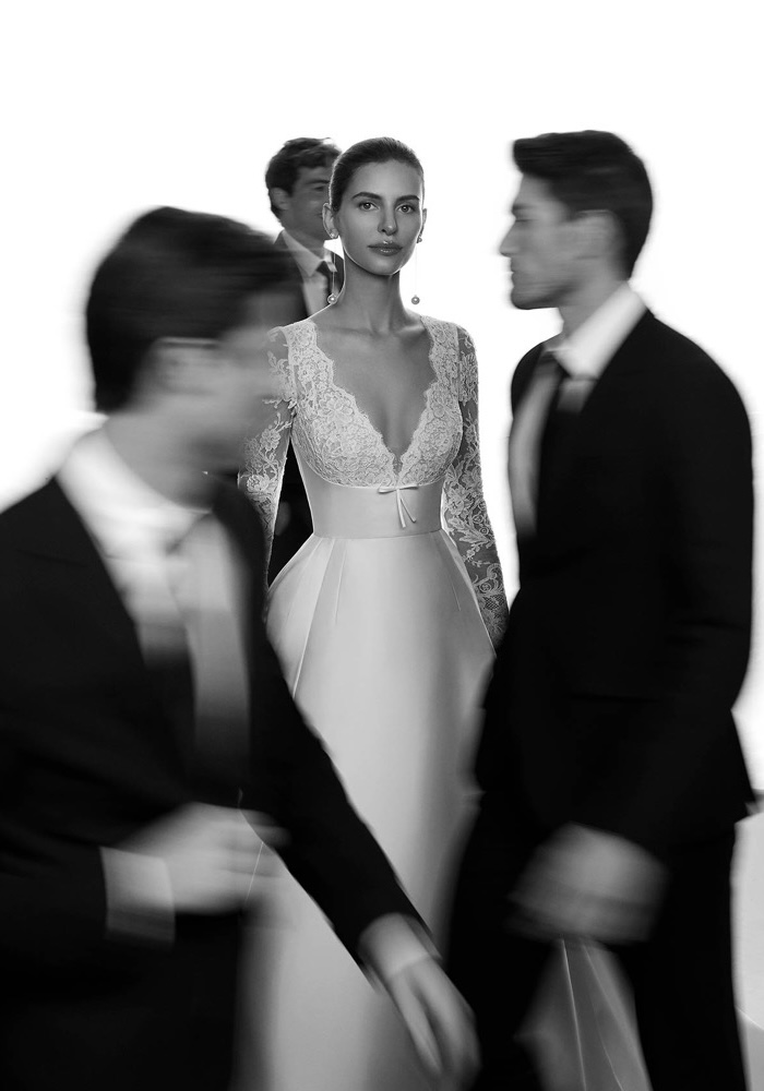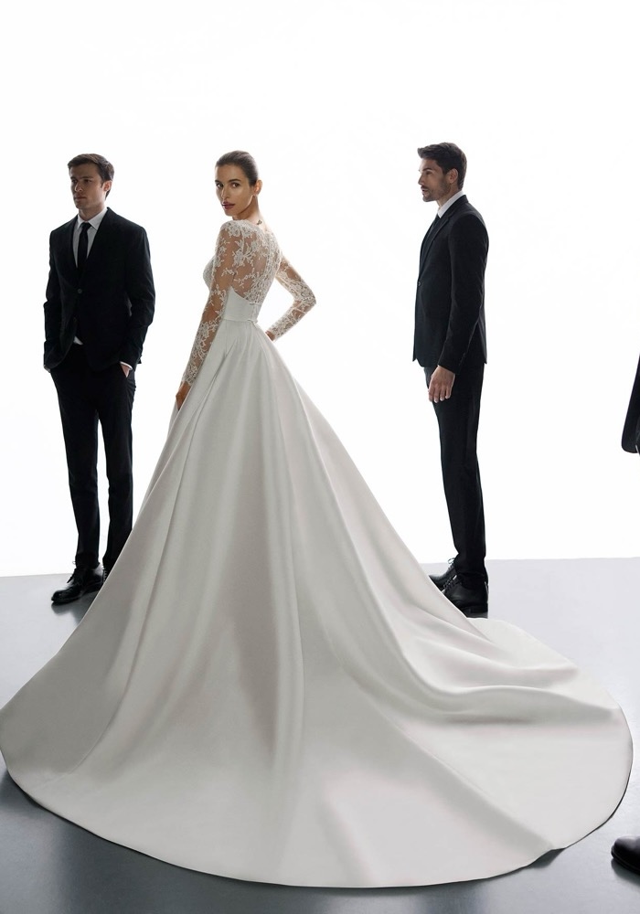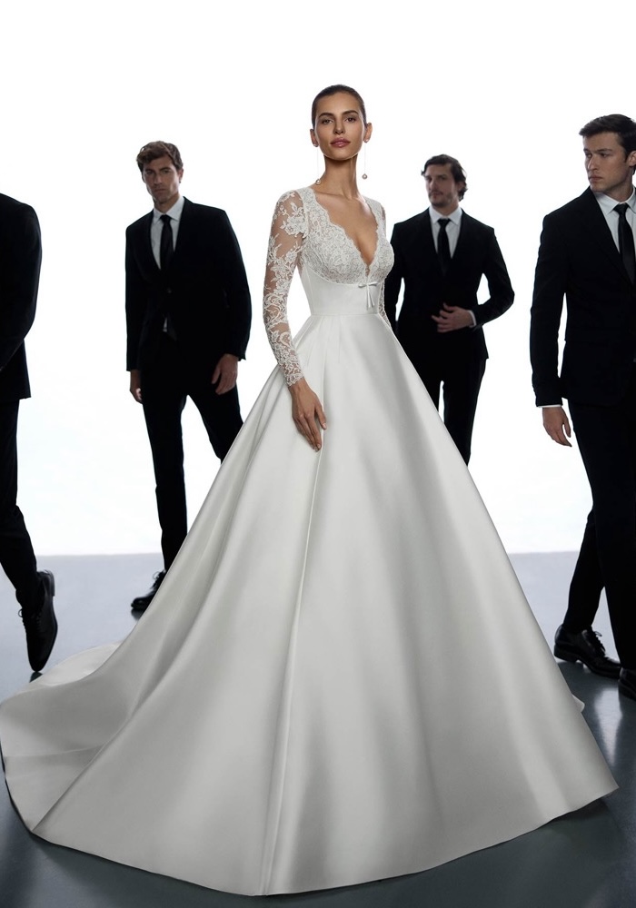 Plunging V-neck princess wedding dress crafted in Mikado with a beautiful floral lace bodice with tattoo-effect sleeves and back. The voluminous Mikado skirt flows into a long, elegant train, creating a breathtaking silhouette.