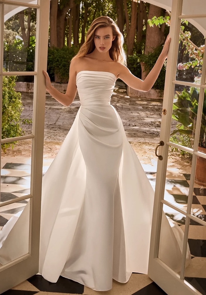 Strapless neckline mermaid wedding dress crafted from satin, featuring a beautifully draped bodice and a removable train.