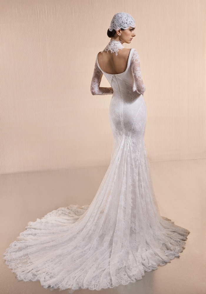 Square neck mermaid wedding dress crafted from delicate lace adorned with intricate beading at the neckline with illusion sleeves.
