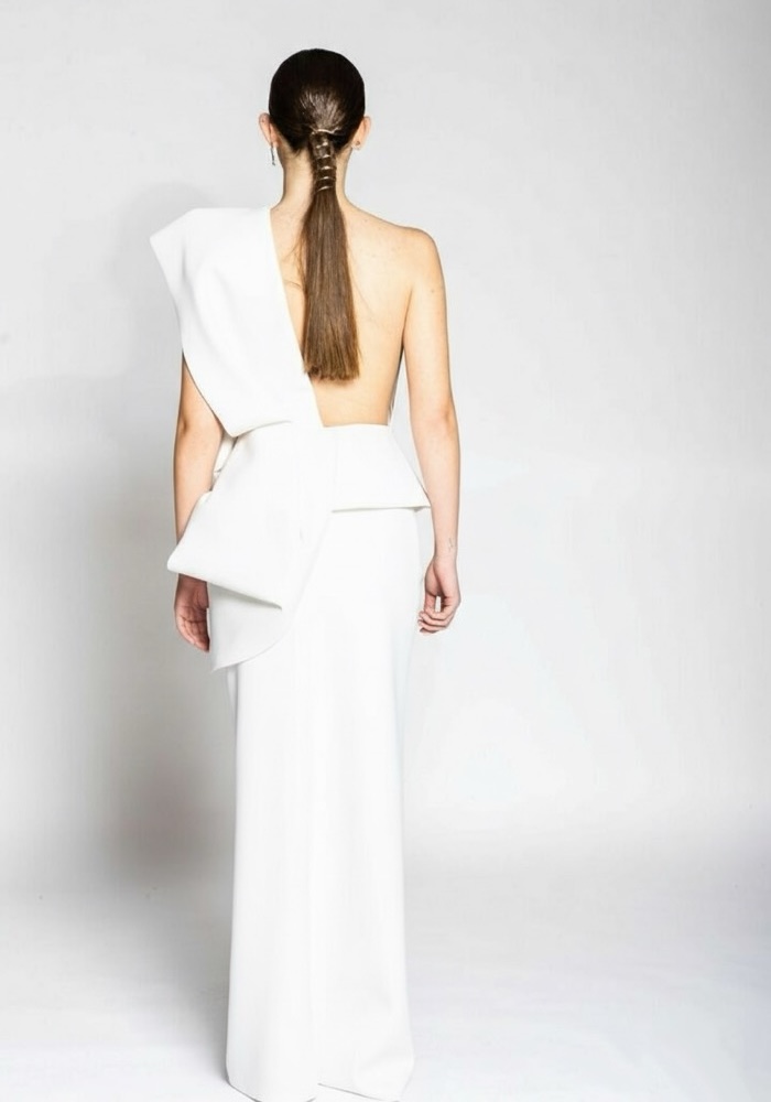 One-shoulder column wedding dress in satin with a draped bodice and ruffled detail at the waist with a slit.