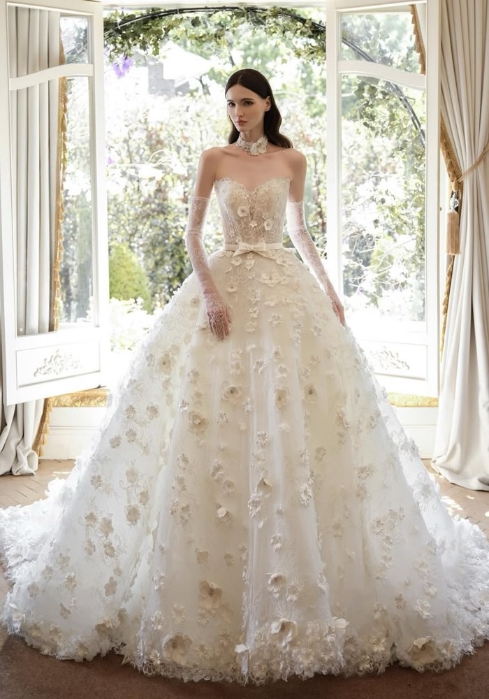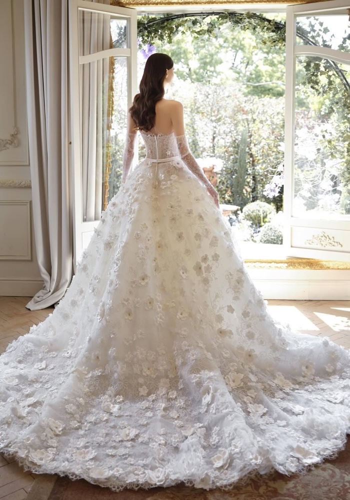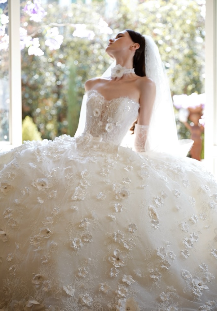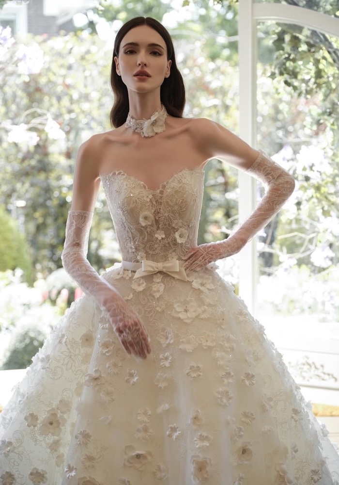 Sweetheart neckline princess wedding dress crafted from Chantilly lace, adorned with cascades of 3D flowers and beadwork, cinched by a thin satin bow at the waist.