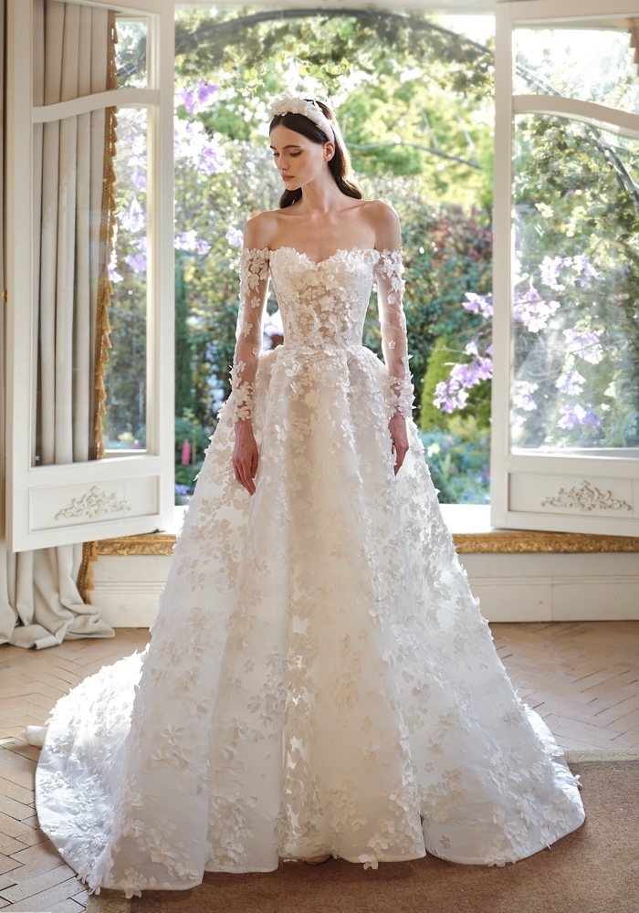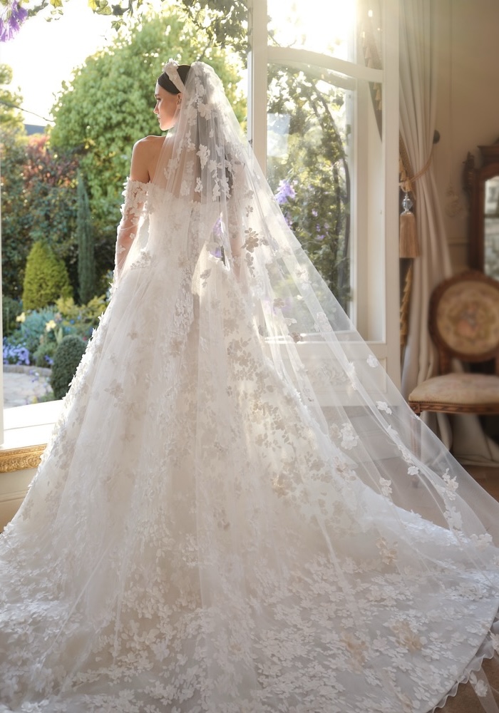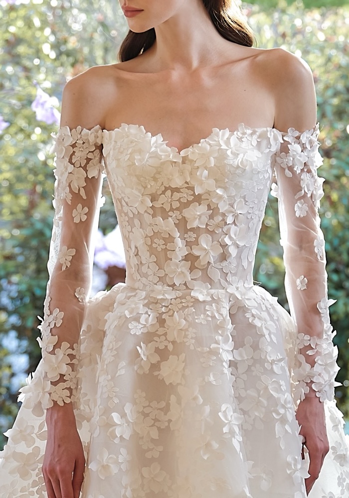 Sweetheart neckline princess wedding dress with a sculpting corset bodice for a perfect fit. The magic unfolds as hundreds of handmade chiffon flowers cascading down the skirt, featuring a dramatic long train.