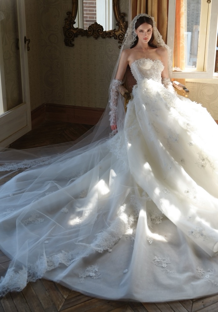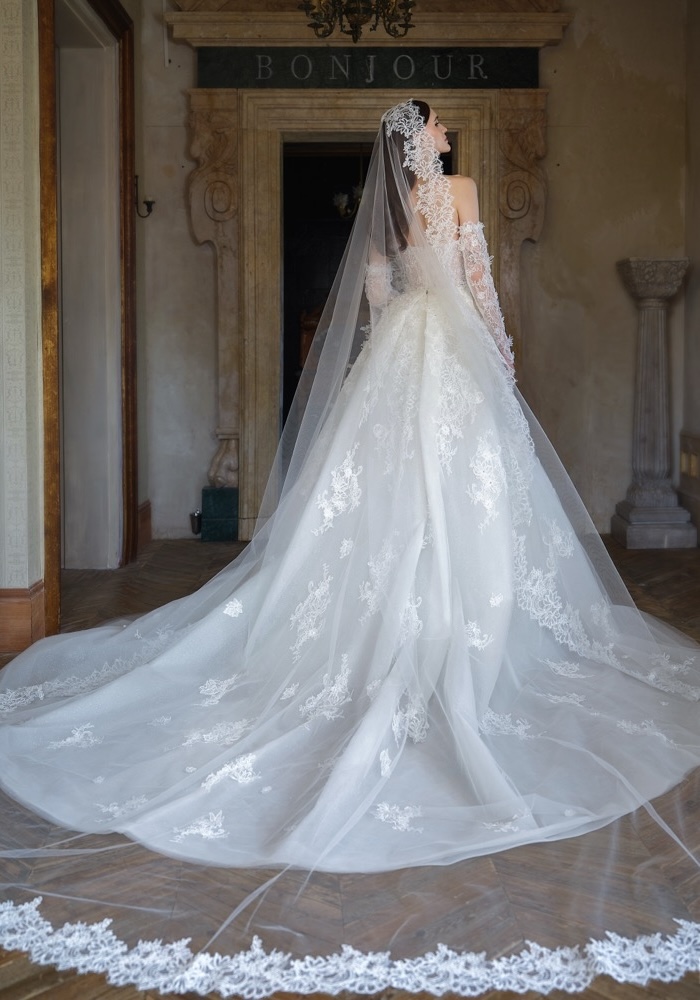 Sweetheart neckline mermaid wedding dress crafted from glistening beaded tulle with a sculpted, corset bodice. Intricate floral motifs are scattered throughout the entire gown. Wear it with a princess overskirt to personalise your bridal look.