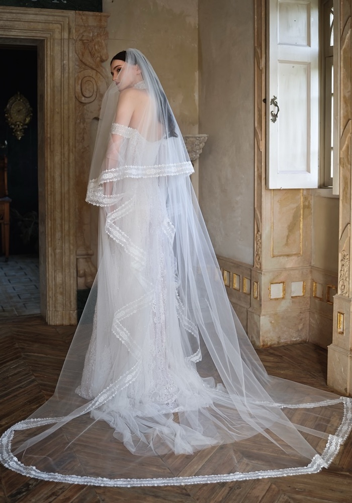 Off-shoulder A-line wedding dress crafted from Chantilly lace adorned with intricate beadwork throughout the entire gown.