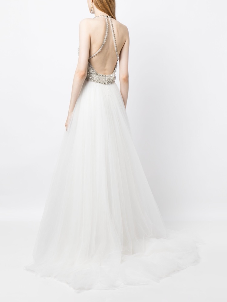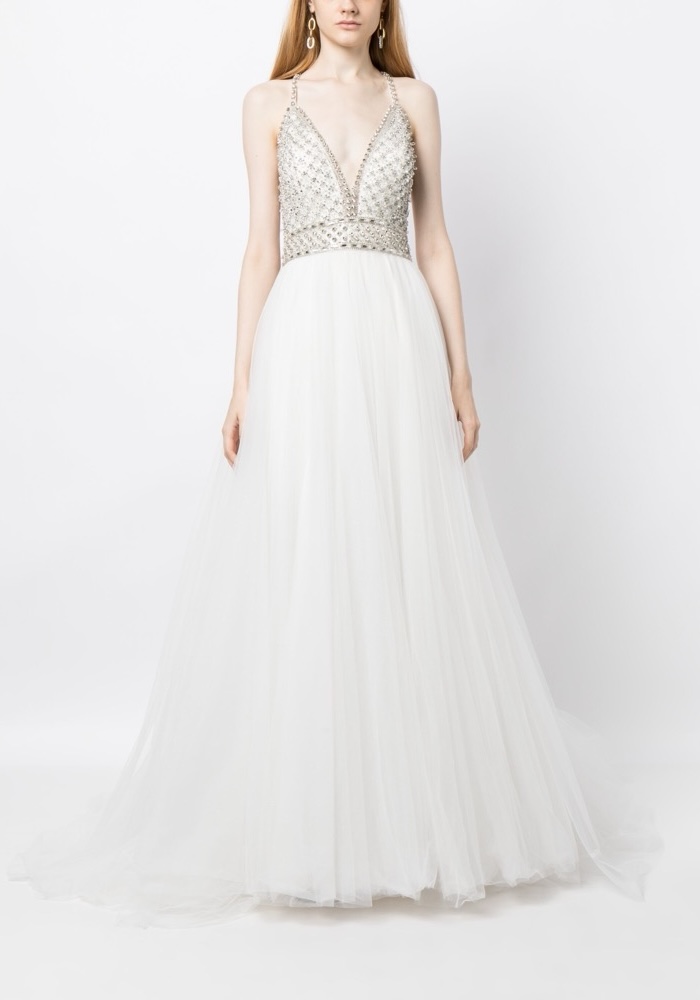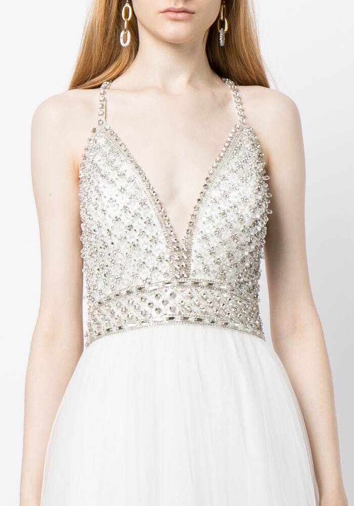 Plunging V-neck princess wedding dress with a beautiful gemstones embellished bodice featuring a flowing glitter tulle skirt.