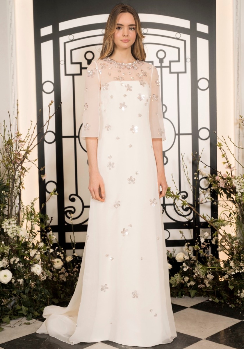 A crew neck column wedding dress with light-catching small flowers decorated all over the dress with mid-sleeves.