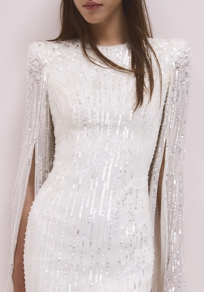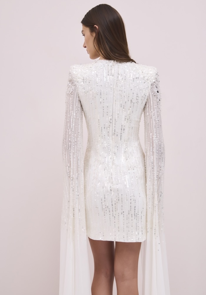Crew neck short bridal dress adorned with cascading sequin embellishments, featuring long, flowing sleeves that add a touch of dramatic elegance.