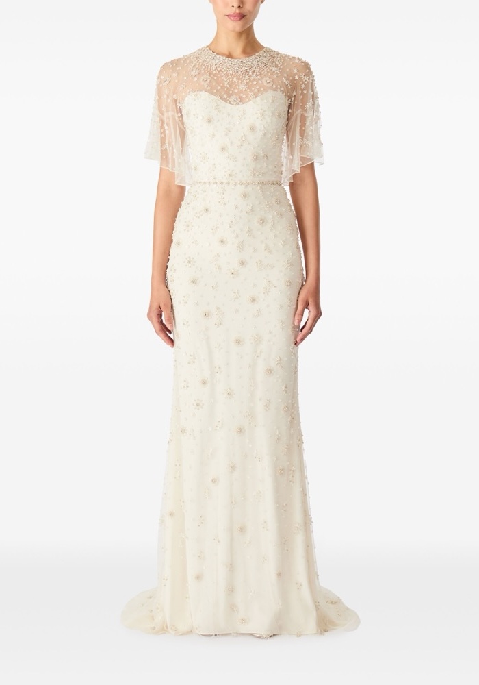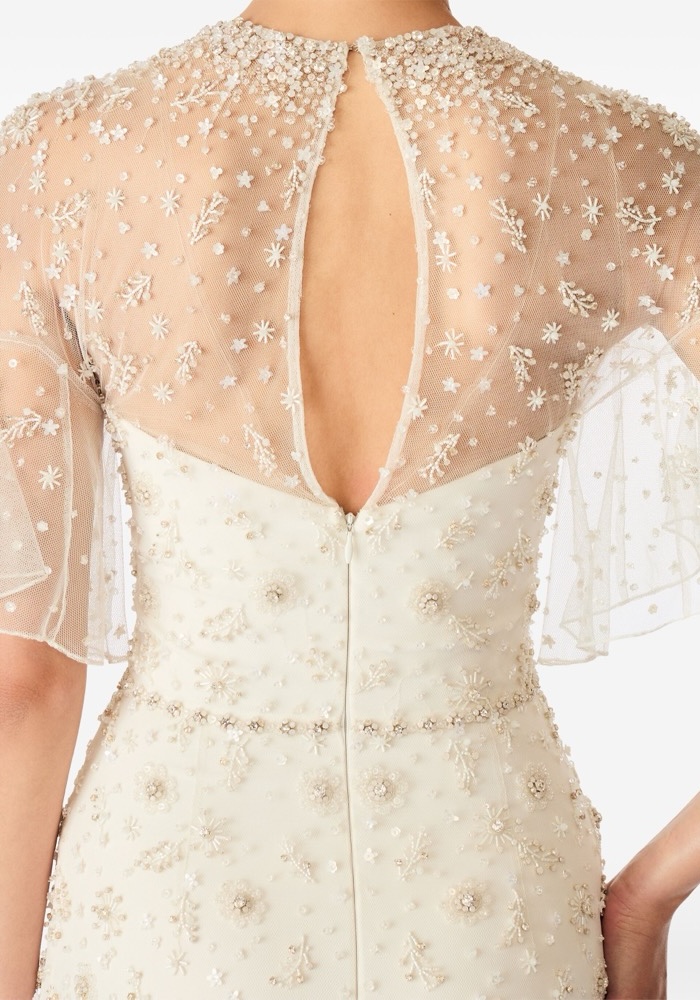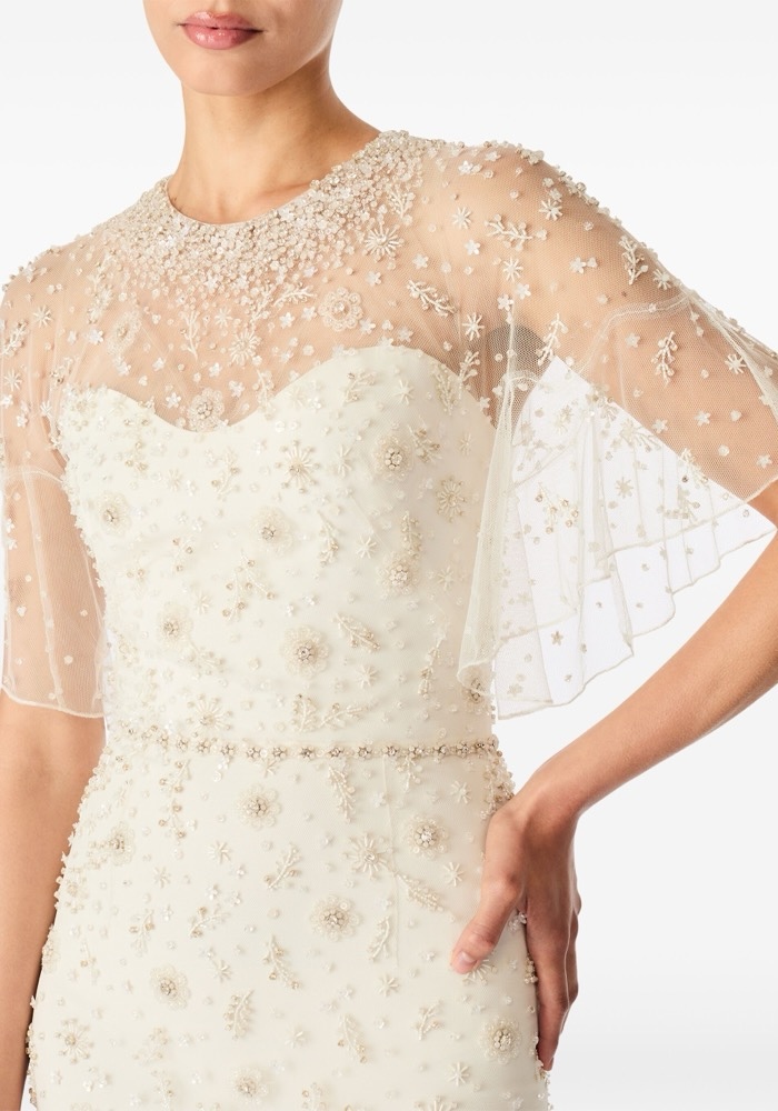 Illusion neckline column wedding dress adorned with exquisite floral embellishments allover with ruffle sleeves.