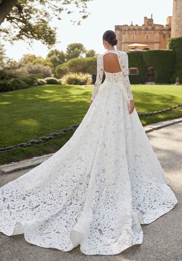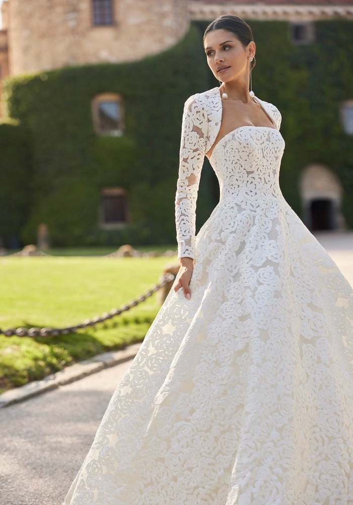 Strapless neckline princess wedding dress crafted entirely in guipure lace with a dramatic train. Can be paired with an off-shoulder jacket.
