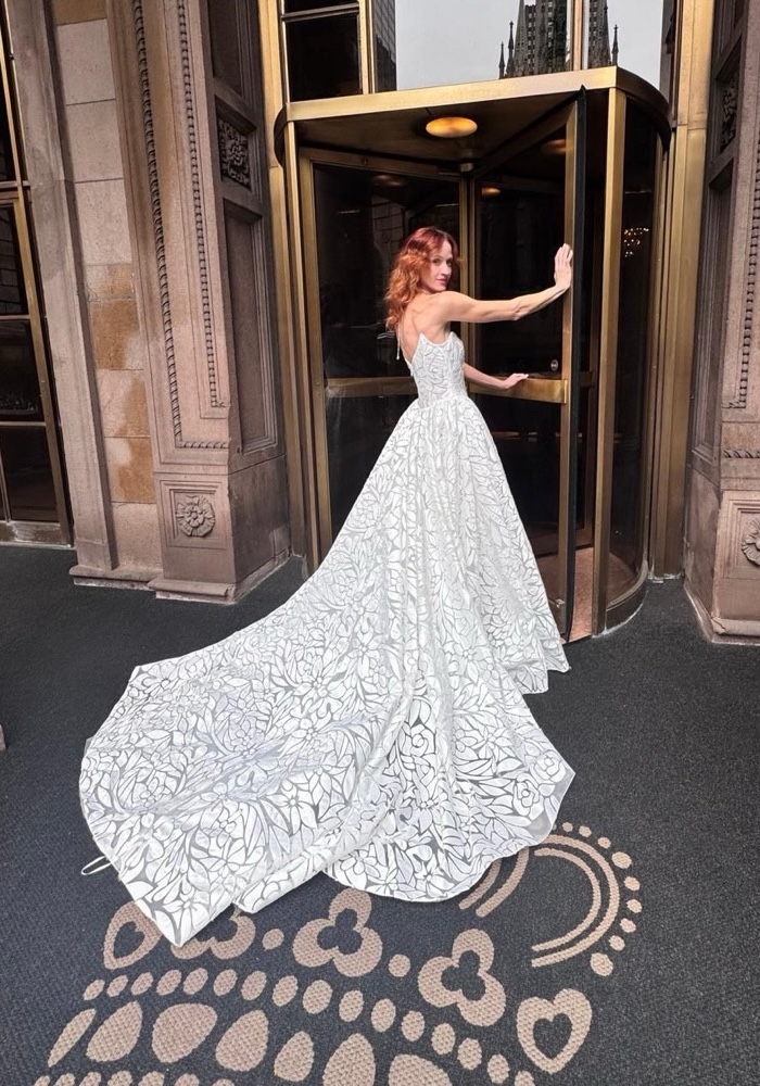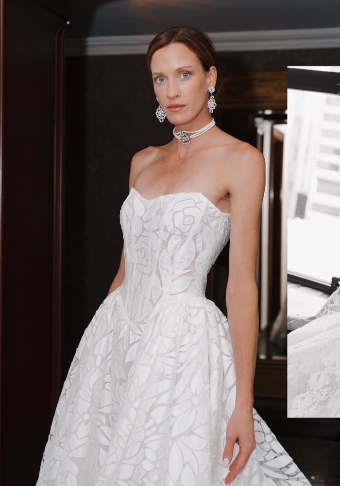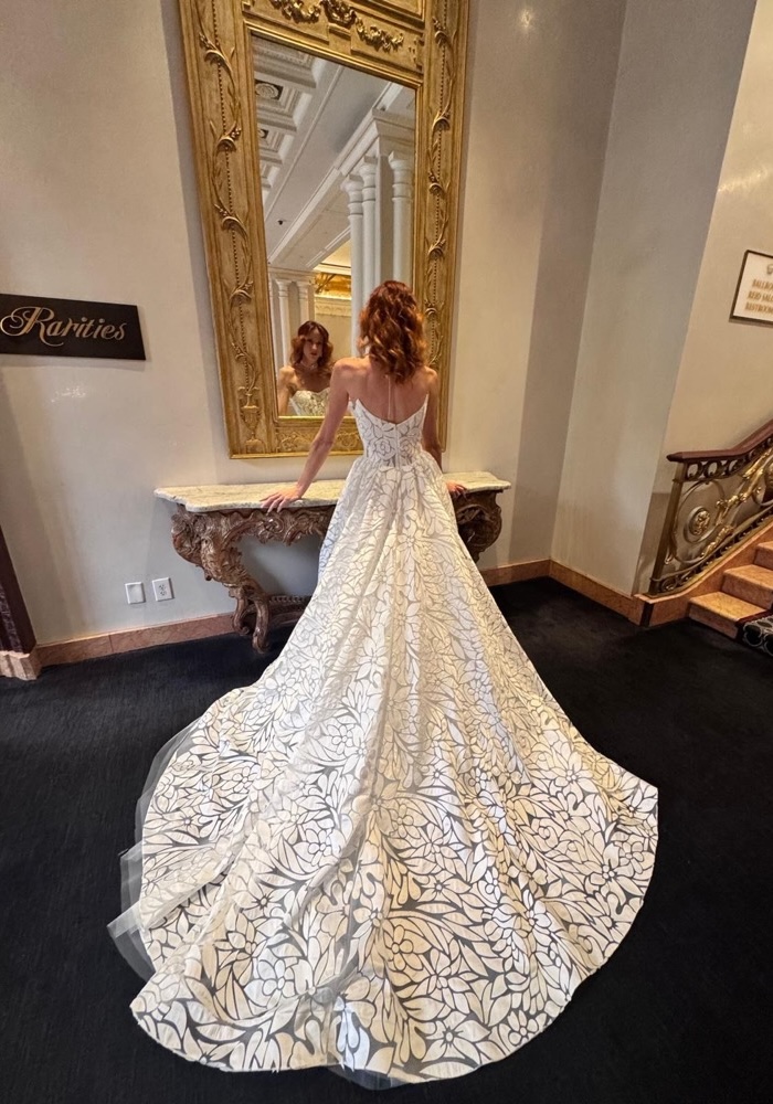 Embrace your fairytale in this strapless princess wedding gown. A sculpted corset bodice sculpts and celebrates your silhouette, while a delicate scattering of intricate floral appliques blooms across the skirt. This dress whispers serene femininity, perfect for the bride who dreams of timeless romance, reimagined with a contemporary heart.