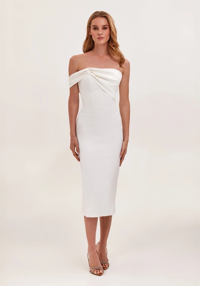 One-shoulder midi dress in stretch crepe with asymmetrical small ruched bust knot-alike detailing flows into a dropped sleeve, perfect for any special occasions.