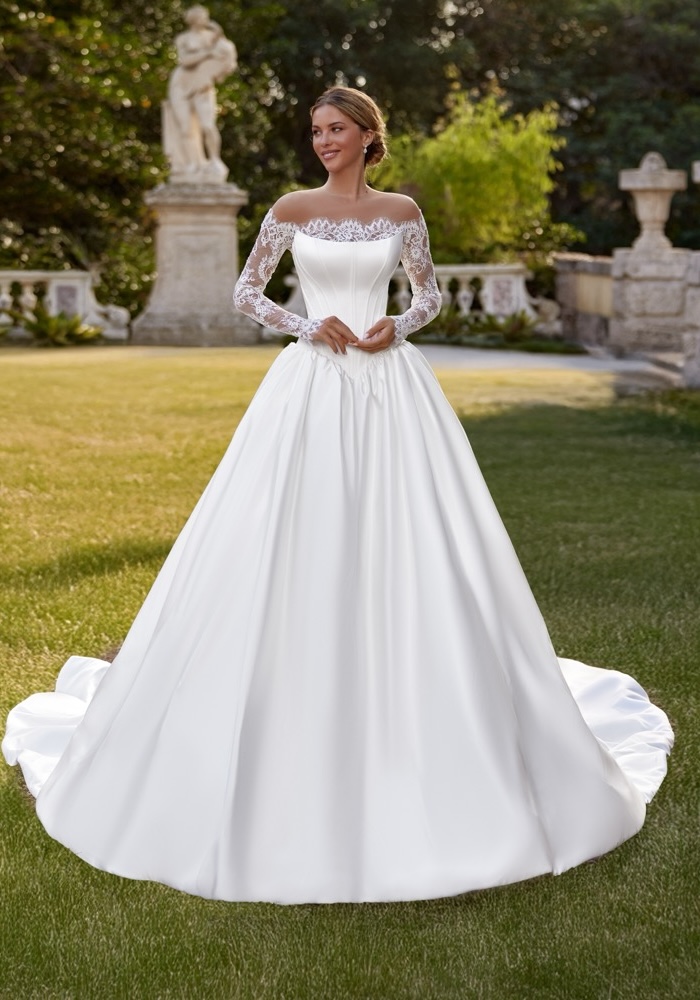 Strapless princess wedding dress crafted from luxurious satin. The structured boned bodice and basque cinch the waist for a flattering silhouette, while the dramatic train sweeps elegantly behind you, creating a truly regal presence.