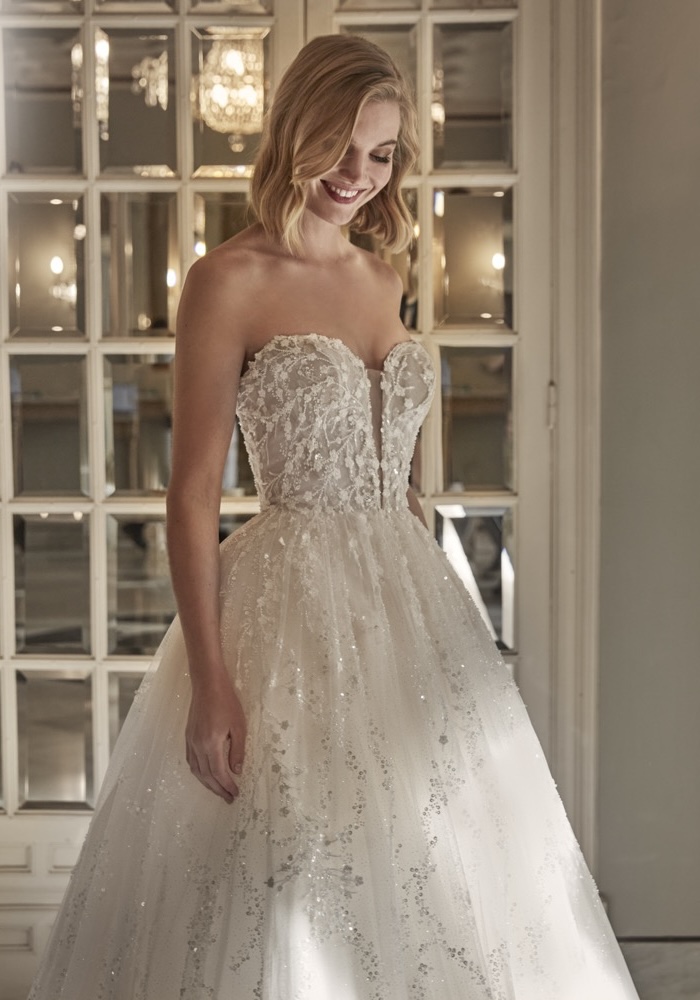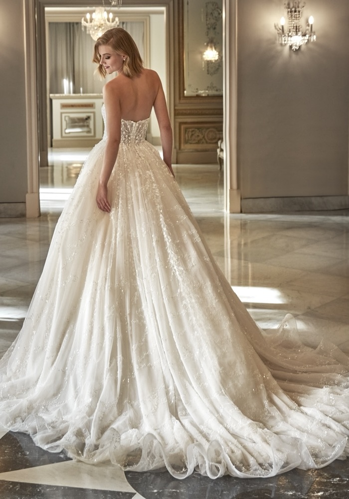 Sweetheart neckline princess wedding dress in glitter tulle, adorned with intricate beadwork and small flowers throughout the entire gown with a dramatic train.