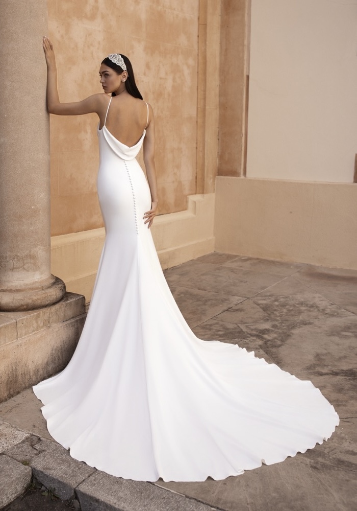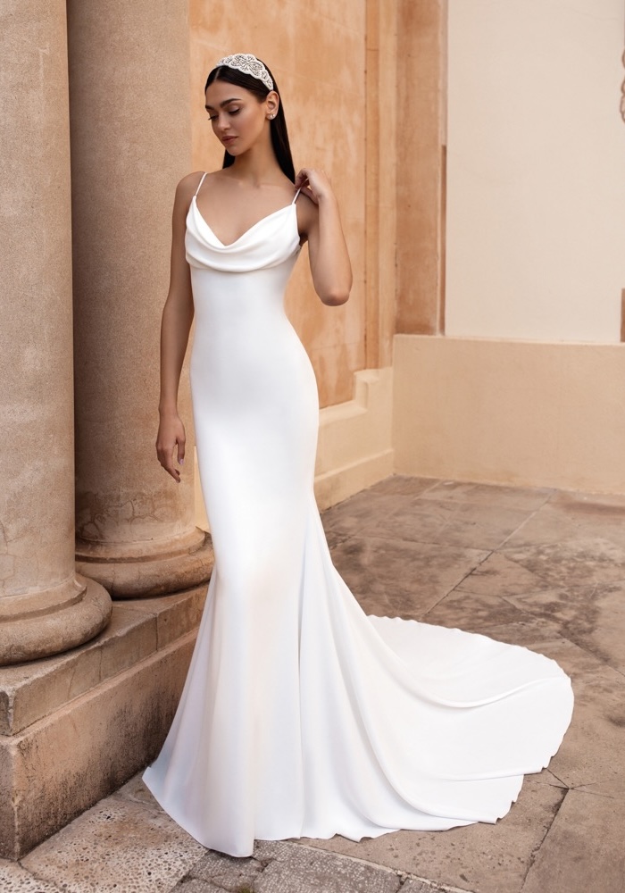 Scoop neck mermaid wedding dress in crepe with loose draping along the neckline and back with thin straps.