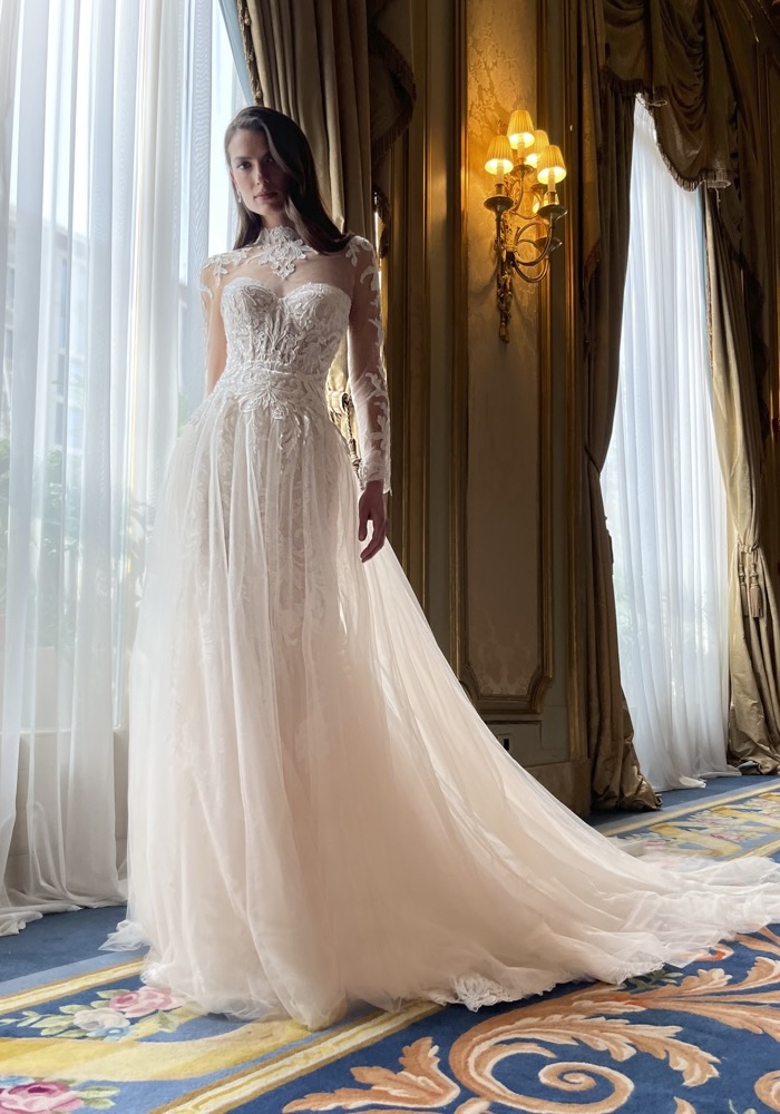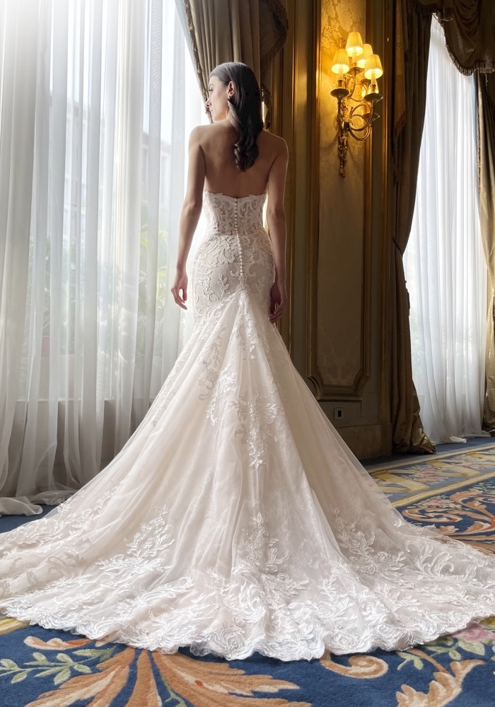 Sweetheart neckline mermaid wedding dress with a corset-style bodice adorned with cascades of intricate lace motifs, featuring a long train. Transform your bridal look with a detachable long-sleeved top and tulle overskirt, allowing for multiple looks in one celebration!