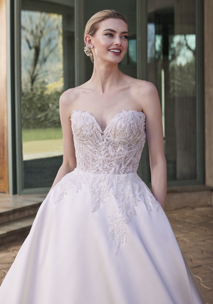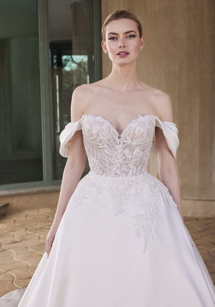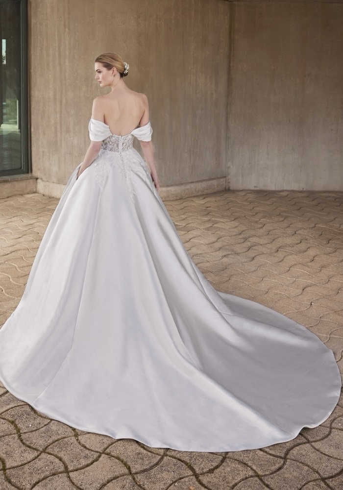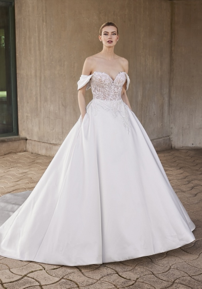 Strapless neckline princess wedding dress with a beautifully embellished bodice and removable dropped sleeves. The voluminous mikado skirt includes practical hidden pockets with a dramatic long train.