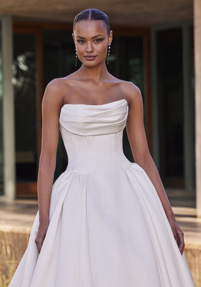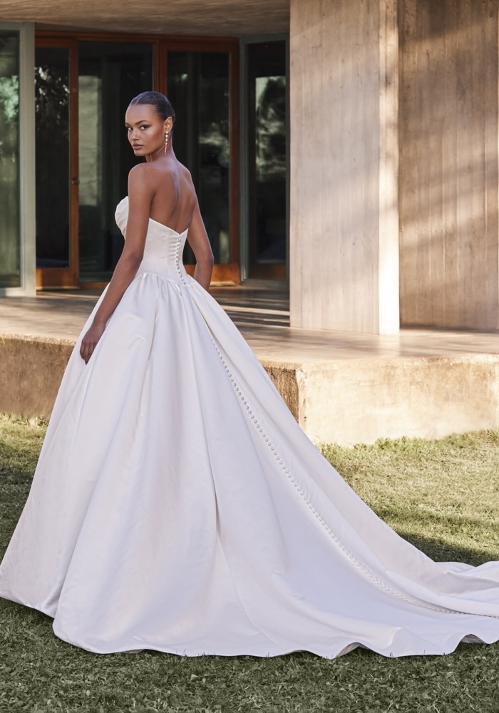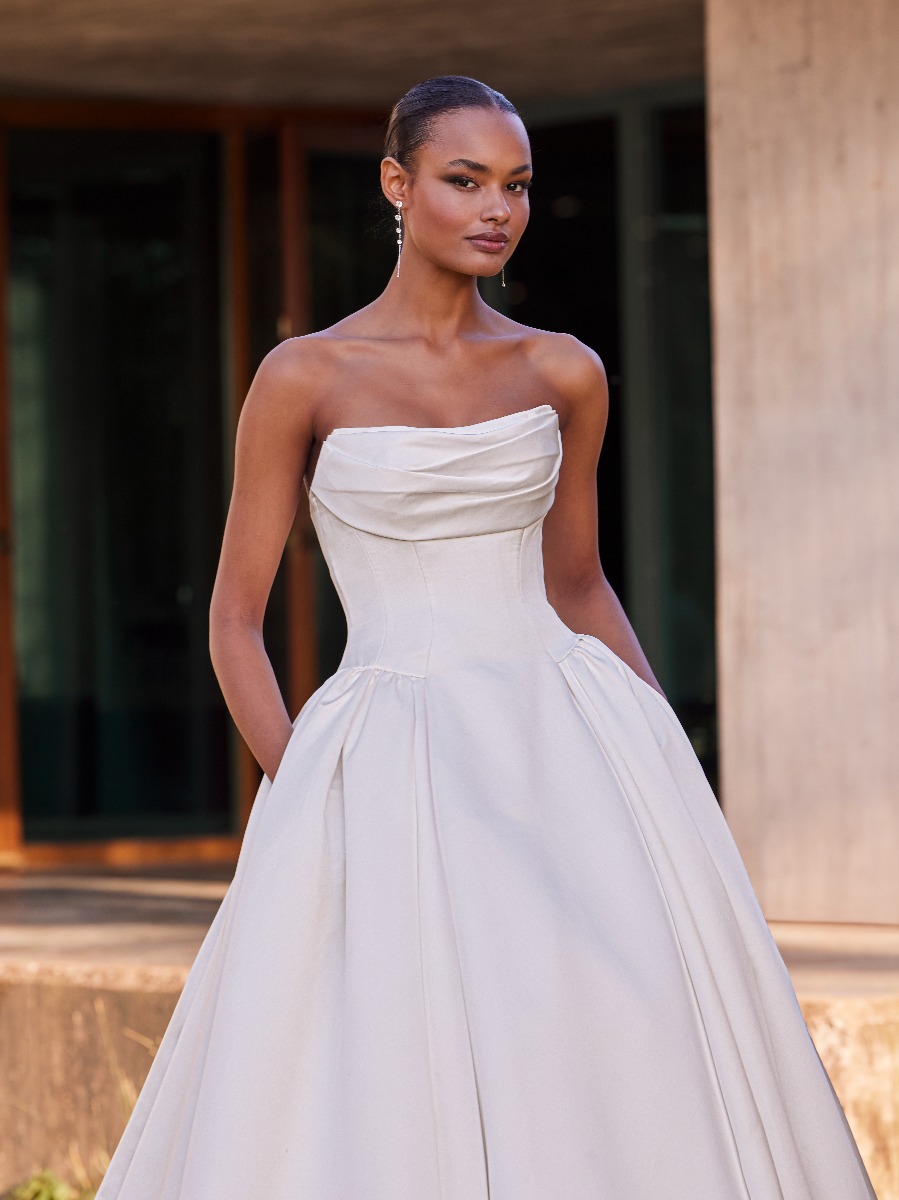 Strapless neckline ball gown crafted from silky satin, featuring a tailored, sculpted bodice with elegant drapery at the neckline. From the fitted waist erupts a voluminous pleated skirt, creating a grand entrance with its sweeping, dramatic train.