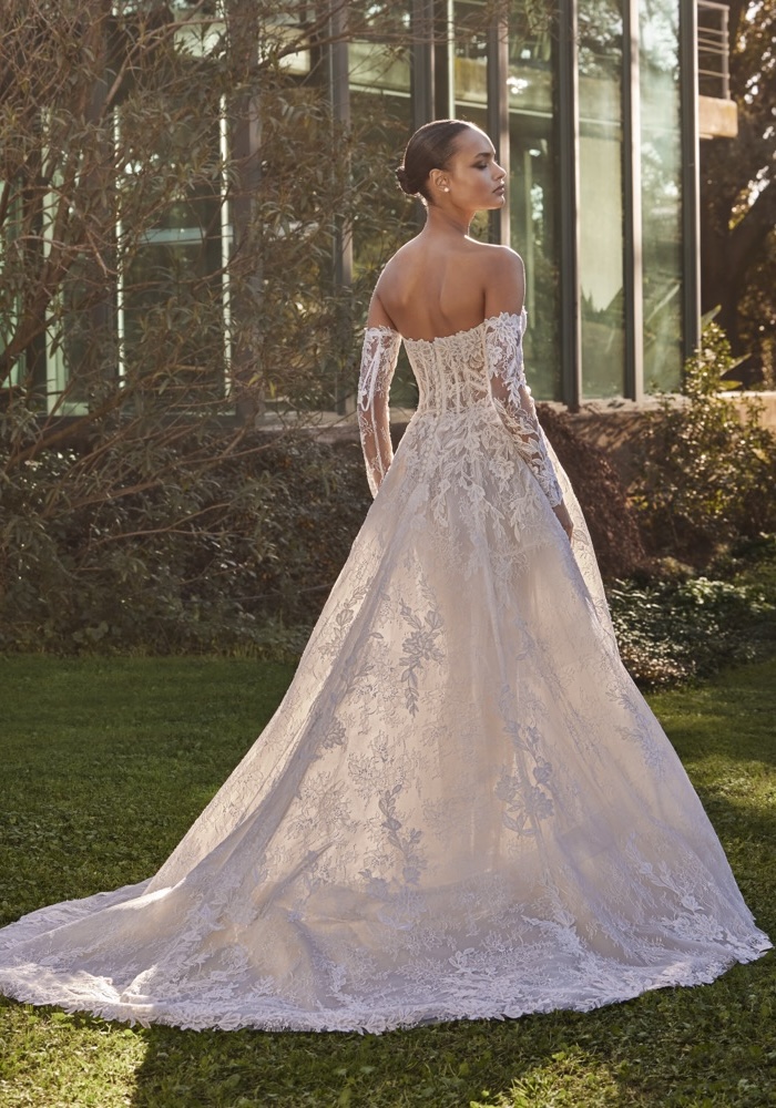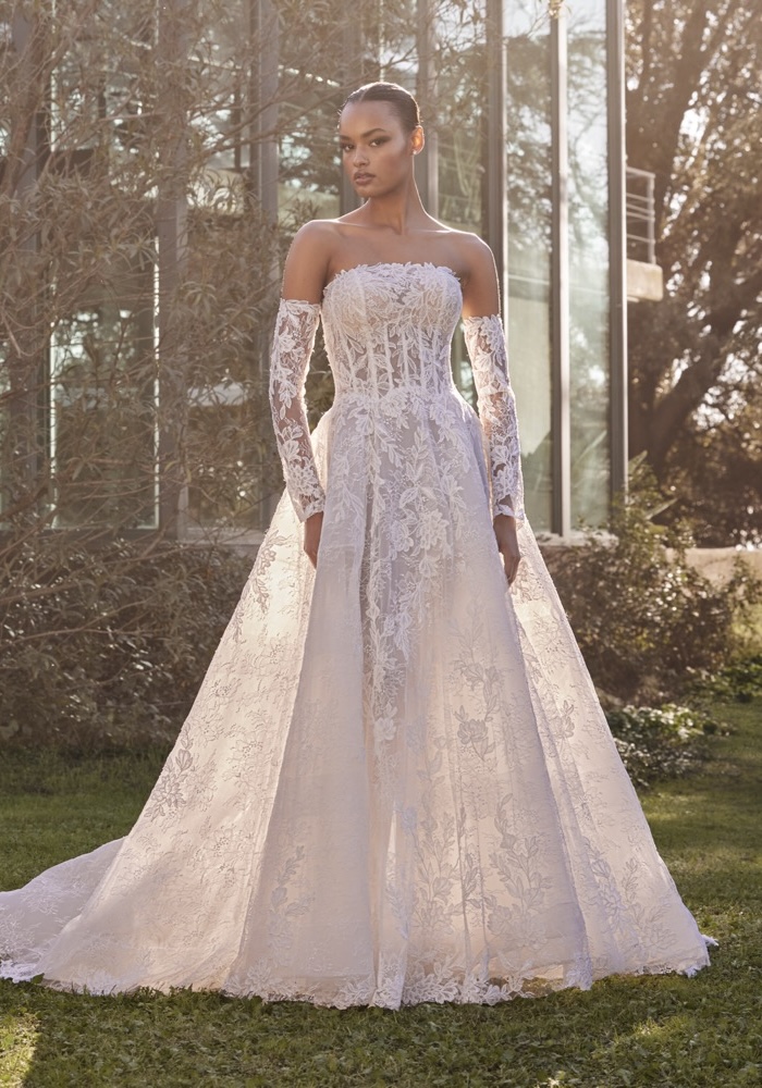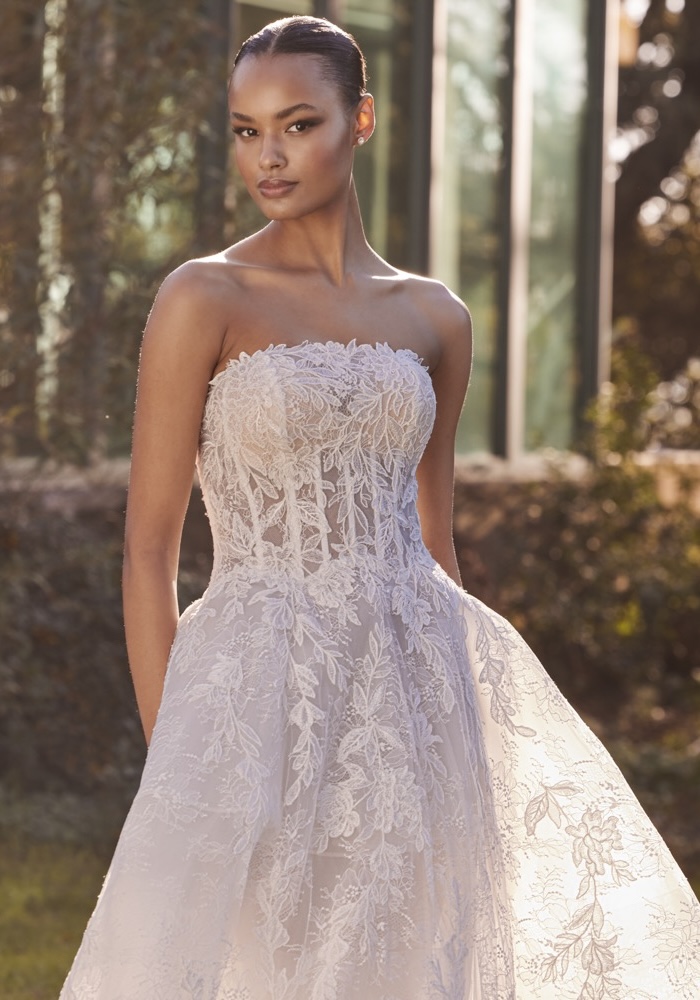 Strapless neckline princess wedding dress made from Chantilly and corded lace, featuring a semi-sheer corset bodice for a sophisticated yet contemporary look.
