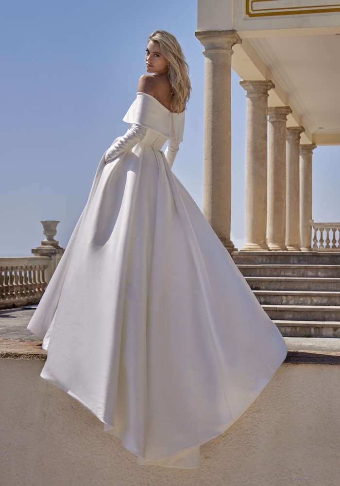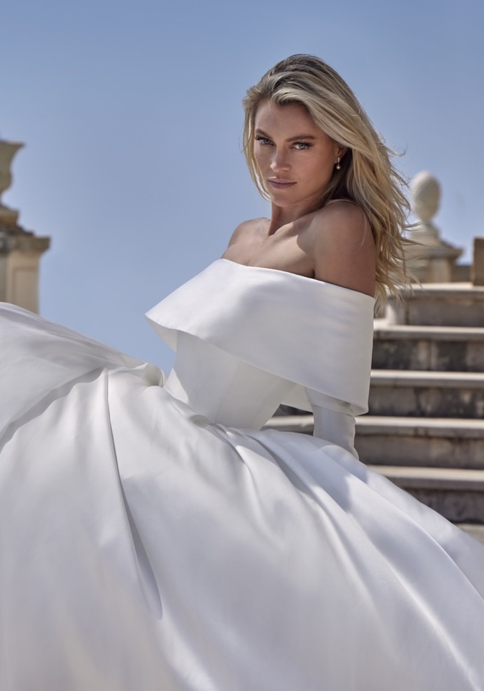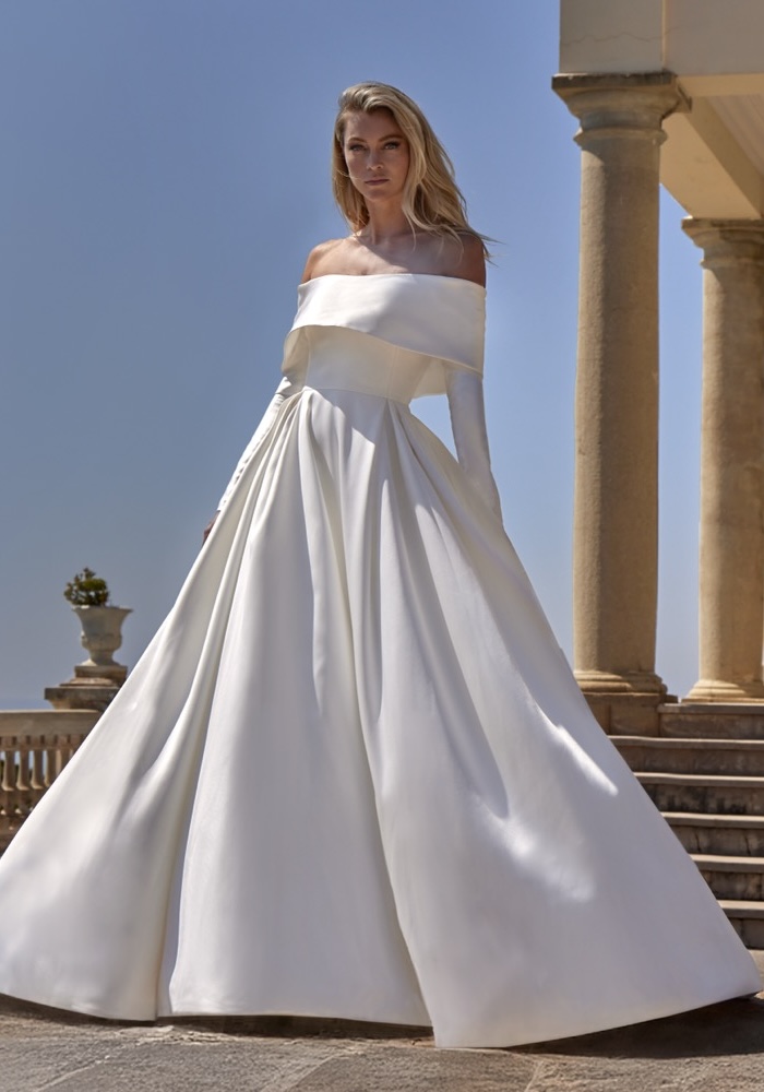 Off-shoulder princess wedding dress crafted from mikado with a folded neckline that highlights the shoulders and collarbone.