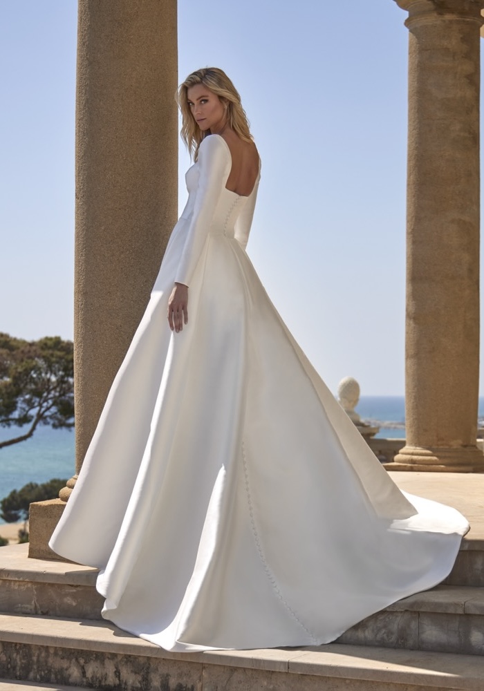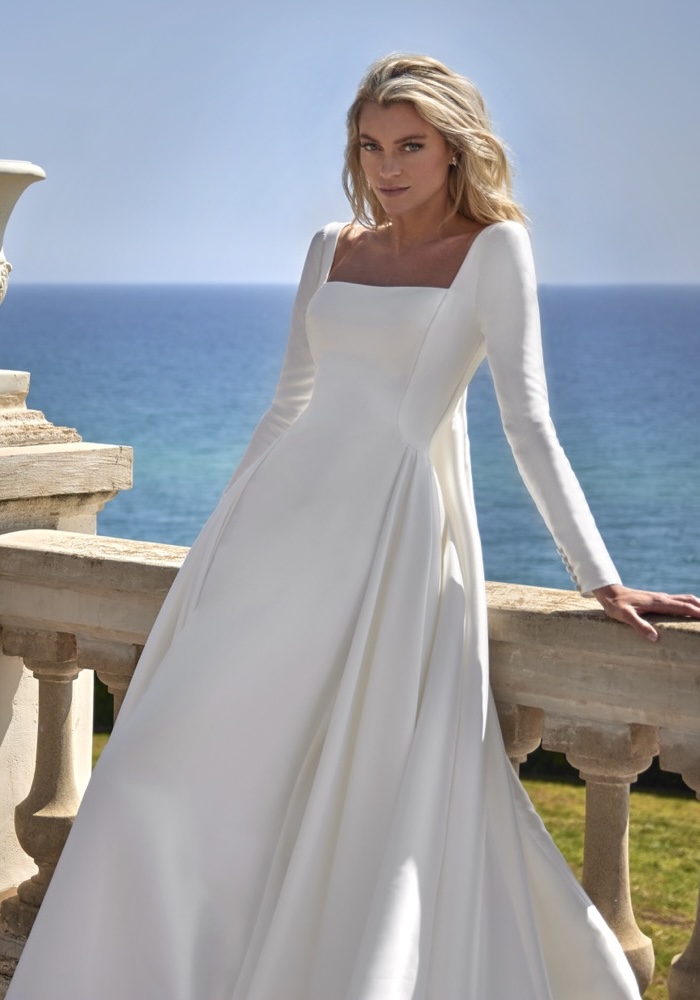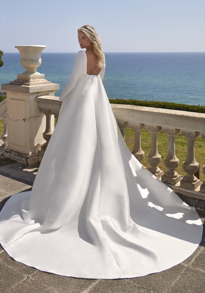 Square neck A-line wedding dress crafted from soft mikado with a low back, featuring a detachable voluminous cape that adds drama.