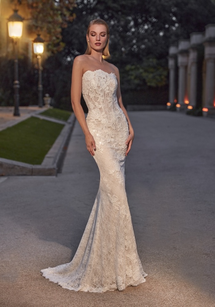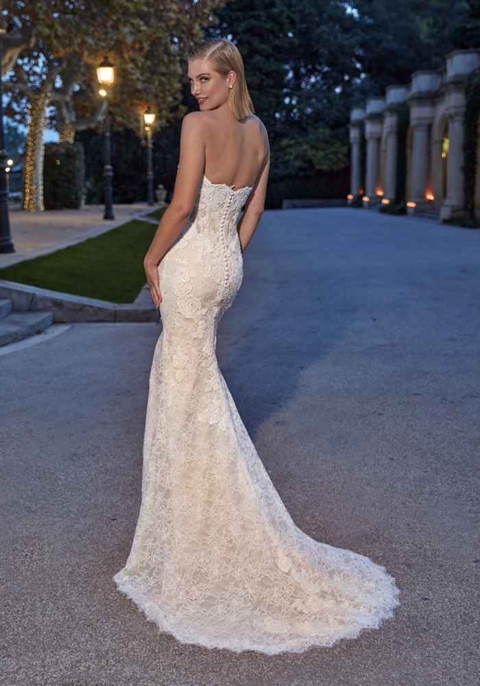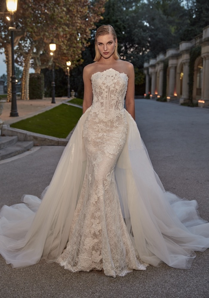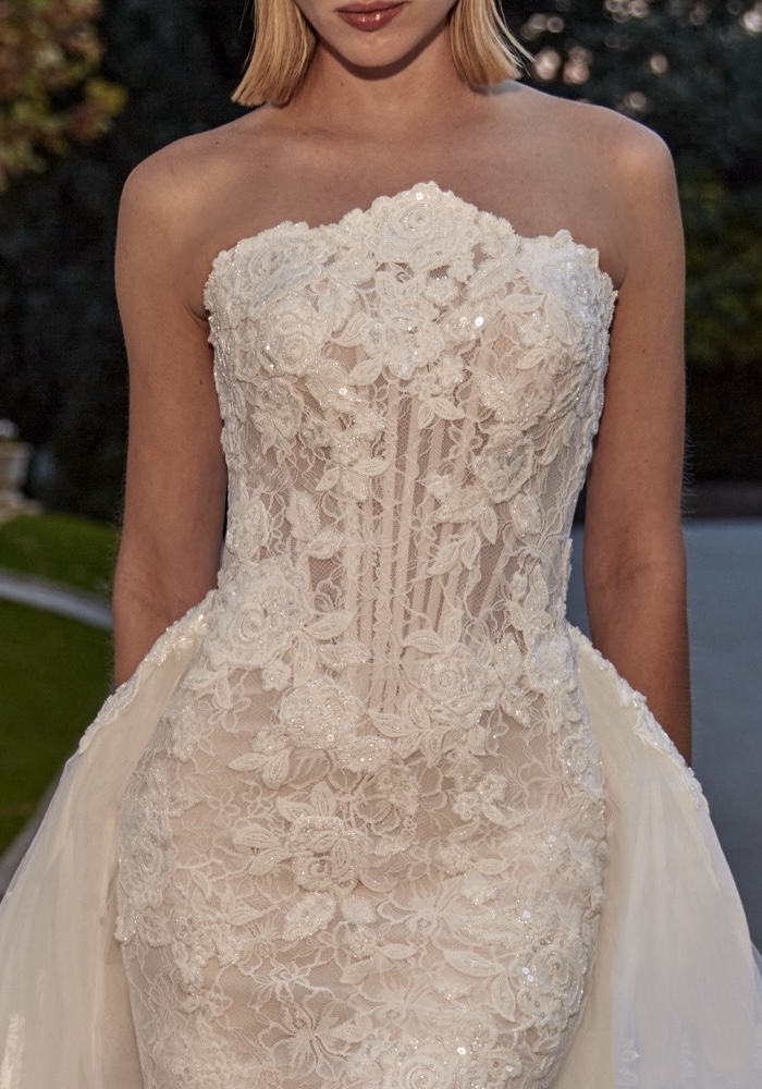 Strapless neckline mermaid wedding dress with a sculpted, corset bodice. Intricate Chantilly lace, ands and pearls are scattered throughout the entire gown. Elevate your bridal look with a removable tulle overskirt to personalise your look.