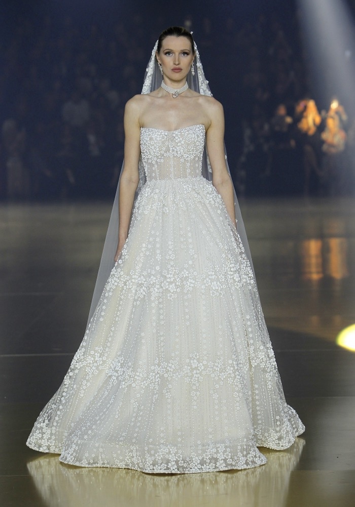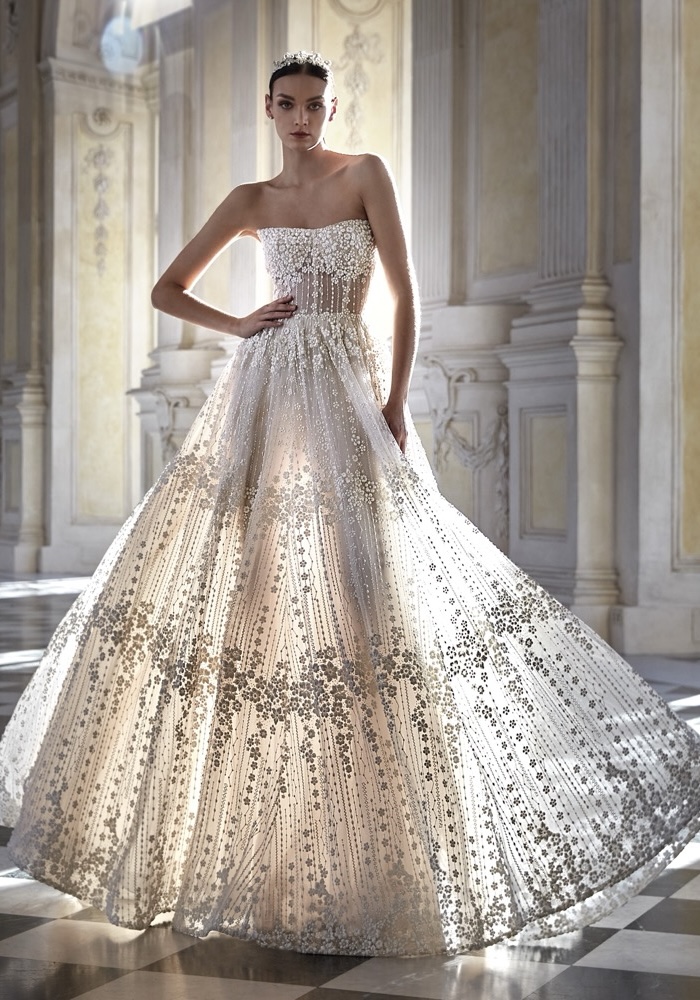 Strapless neckline A-line wedding dress in glitter tulle with a semi-sheer corset bodice bathed in spectacular floral embellishments throughout the entire gown.