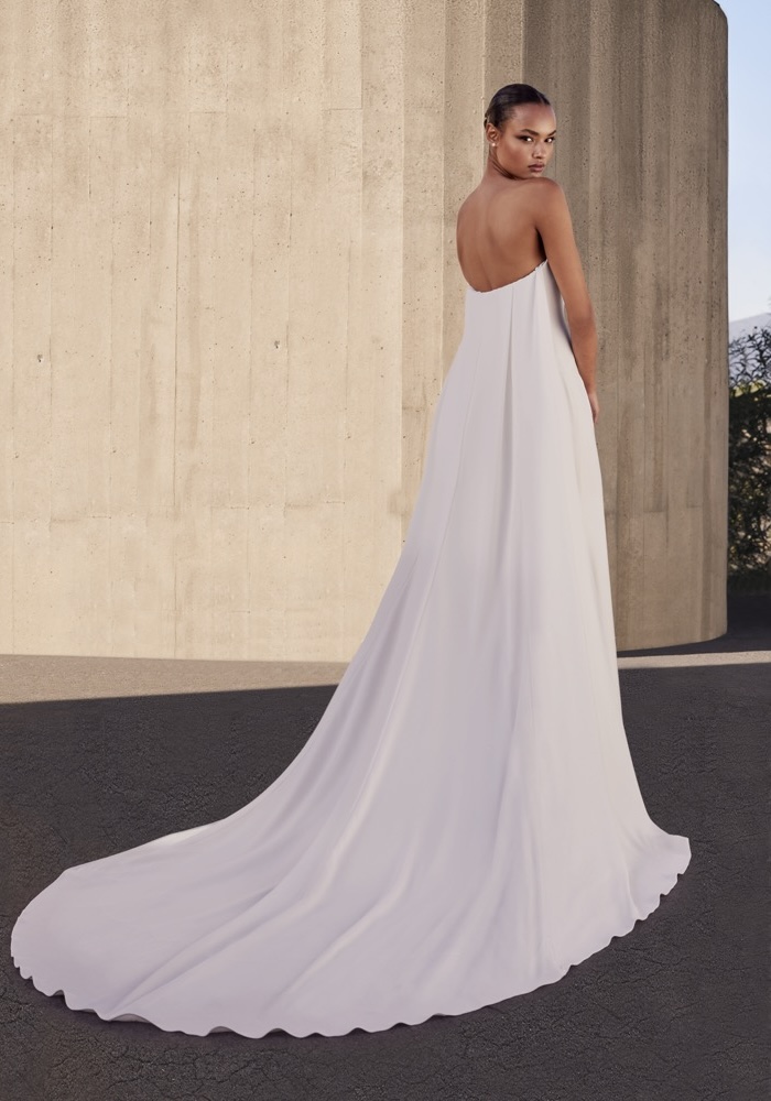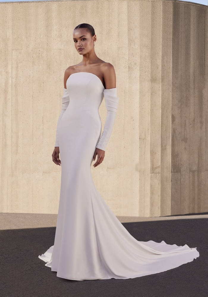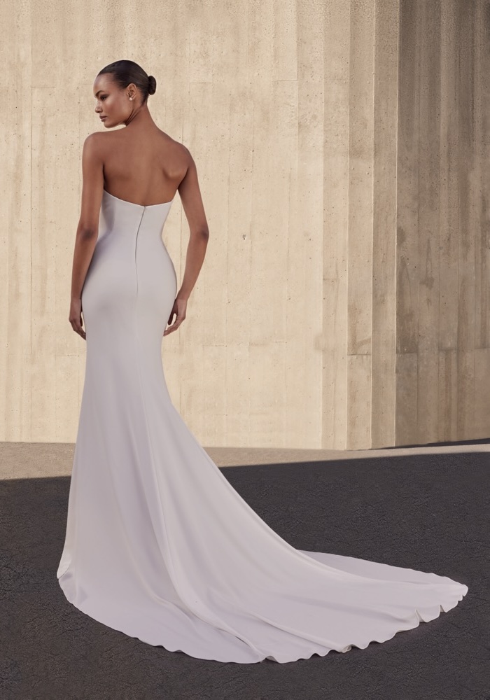 Strapless neckline mermaid wedding dress crafted from crisp crepe fabric with a long train. Pair it with a removable train to personalise your look.
