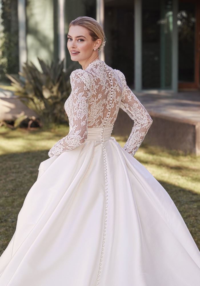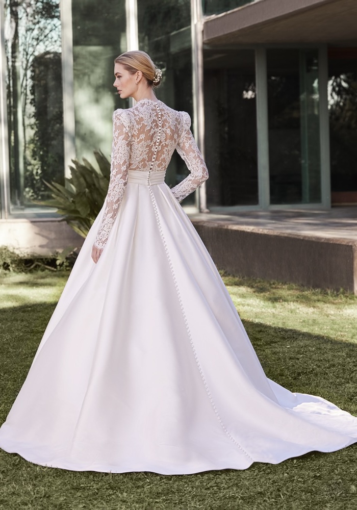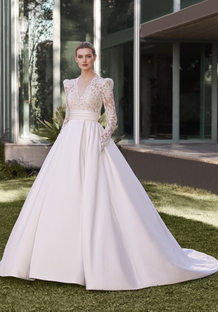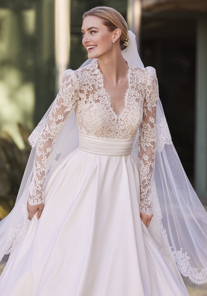 V-neck princess wedding dress with a tattoo-effect lace bodice and sleeves. Pleated skirt made of mikado, blending romantic softness with magnificent presence.