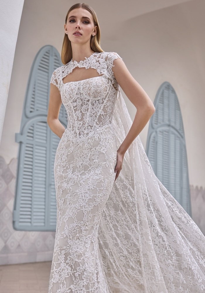 Square neck mermaid wedding dress with a corset bodice adorned with cascades of intricate corded Chantilly lace.