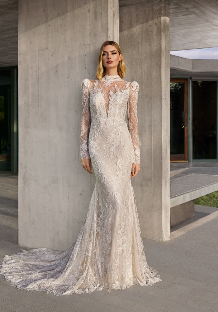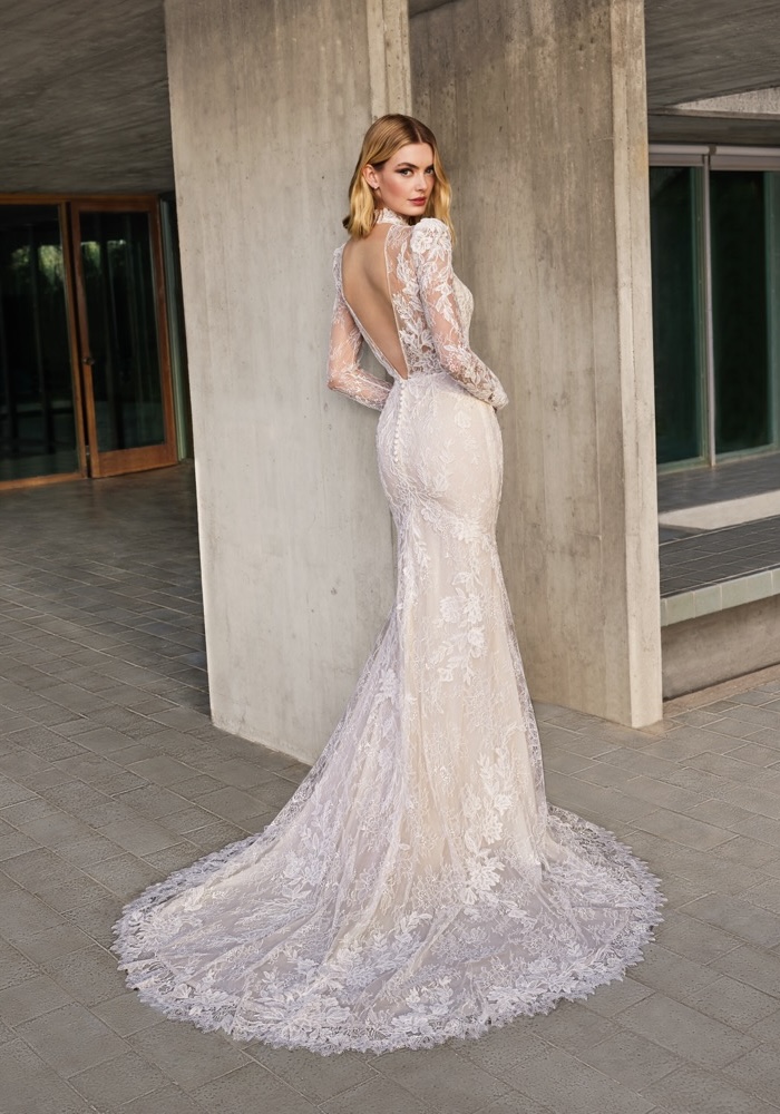 This high neck mermaid wedding dress is made from chantilly and corded lace and features an illusion neckline and sleeves with a plunging back.