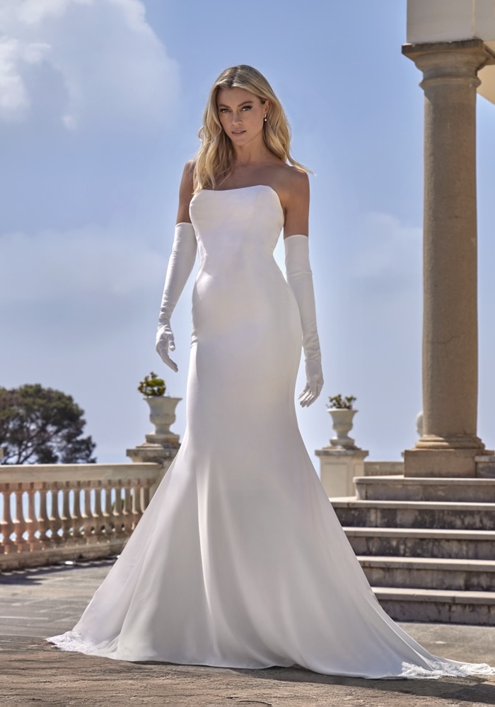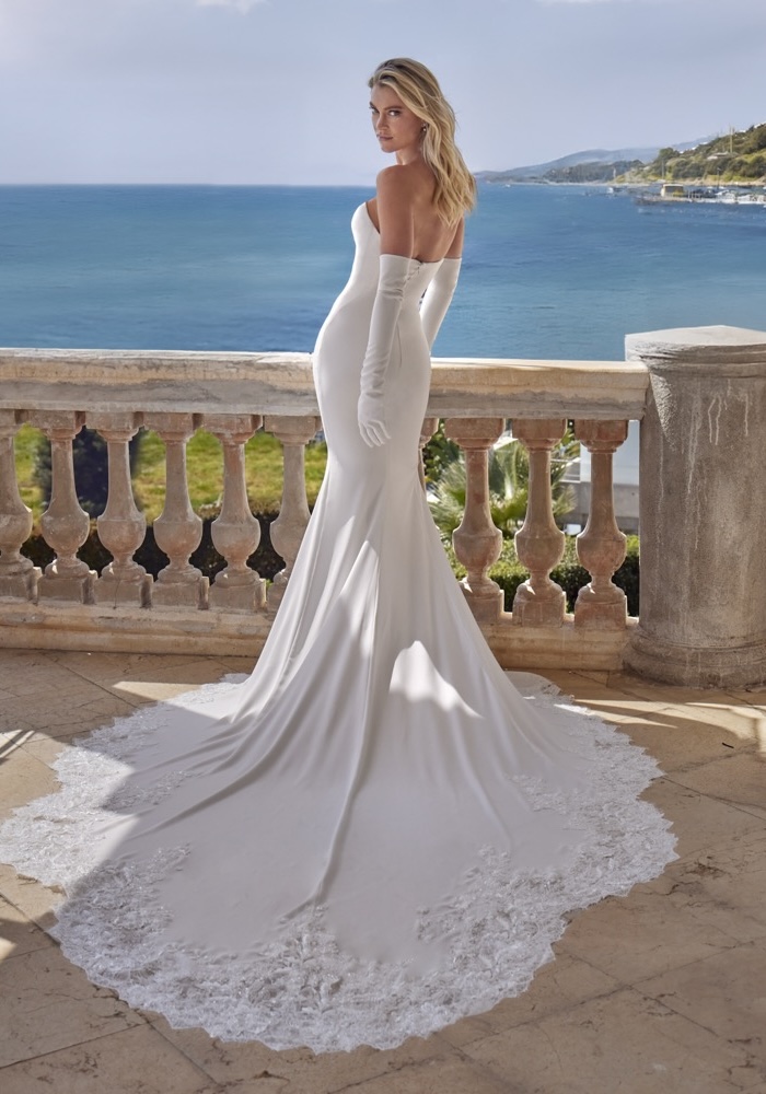 Strapless neckline mermaid wedding dress crafted from stretch crepe, featuring a spectacular train embellished with intricate lace and beadwork.