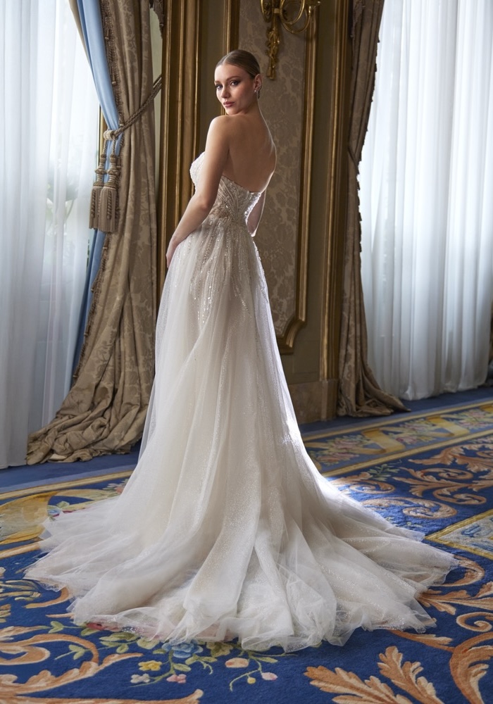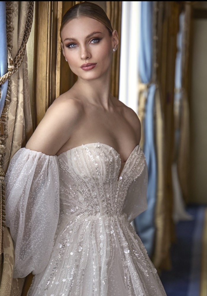 Sweetheart neckline A-line wedding dress crafted from glitter tulle, adorned with intricate beadwork on the bodice. Wear it with puffed sleeves to add volume and a touch of fantasy.