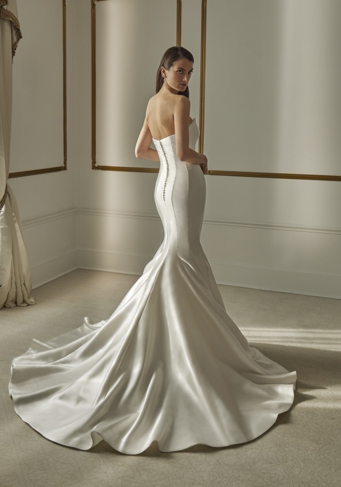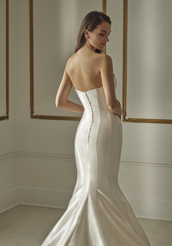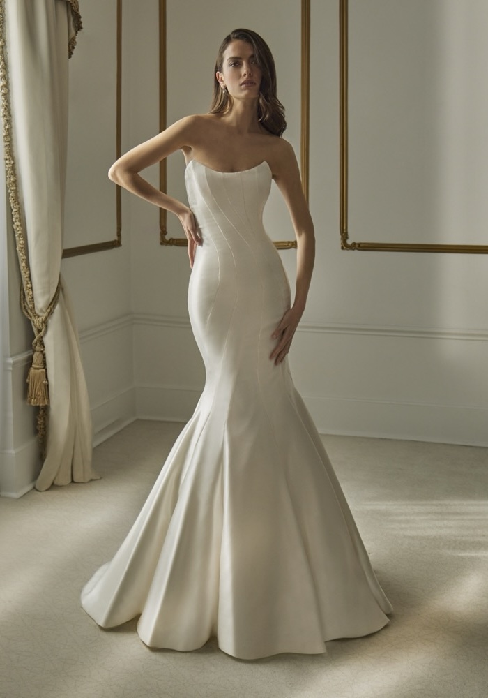 Strapless neckline mermaid wedding dress crafted from soft mikado, featuring decorative seams that add structure and elegance.