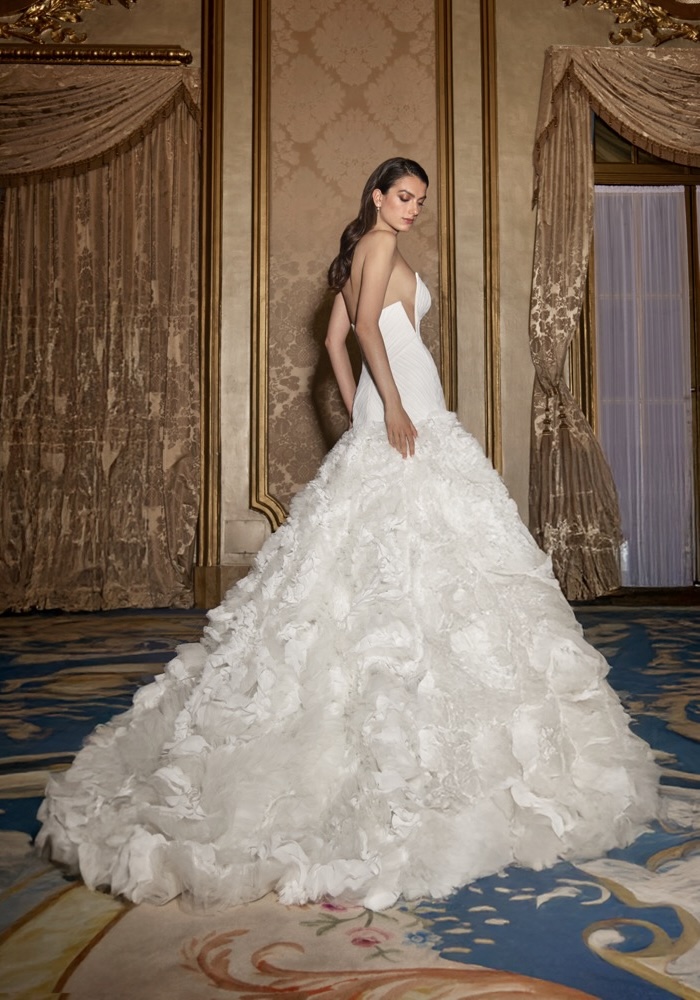 Strapless princess wedding dress with an elongated draped chiffon bodice, featuring a voluminous skirt adorned with raised floral appliques.