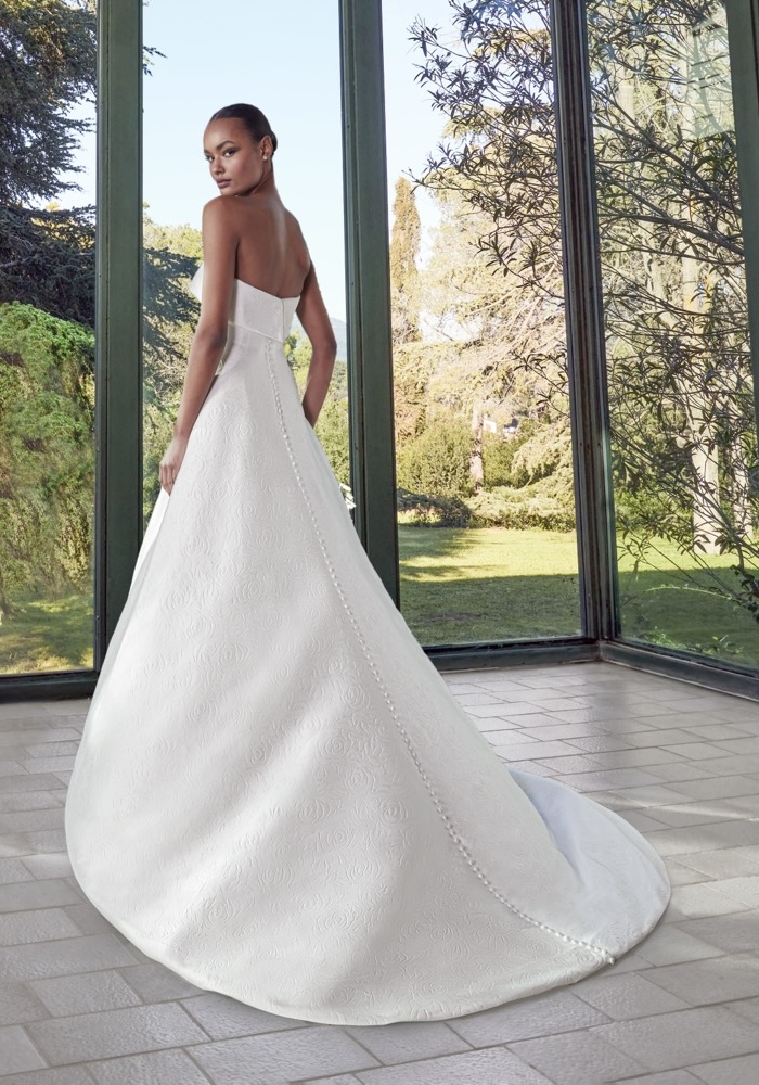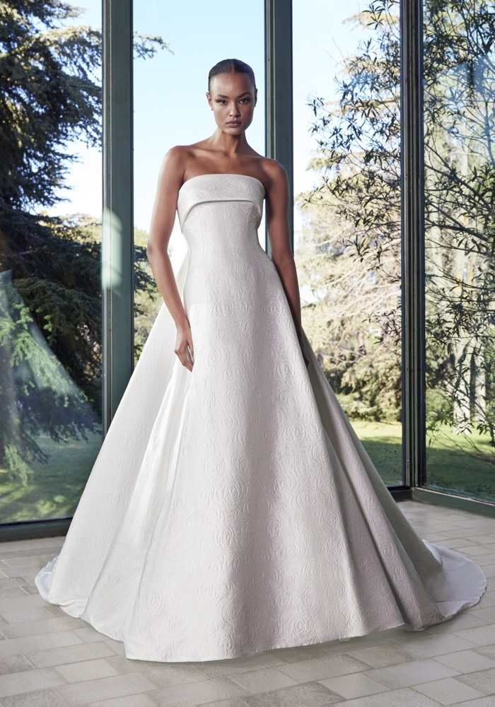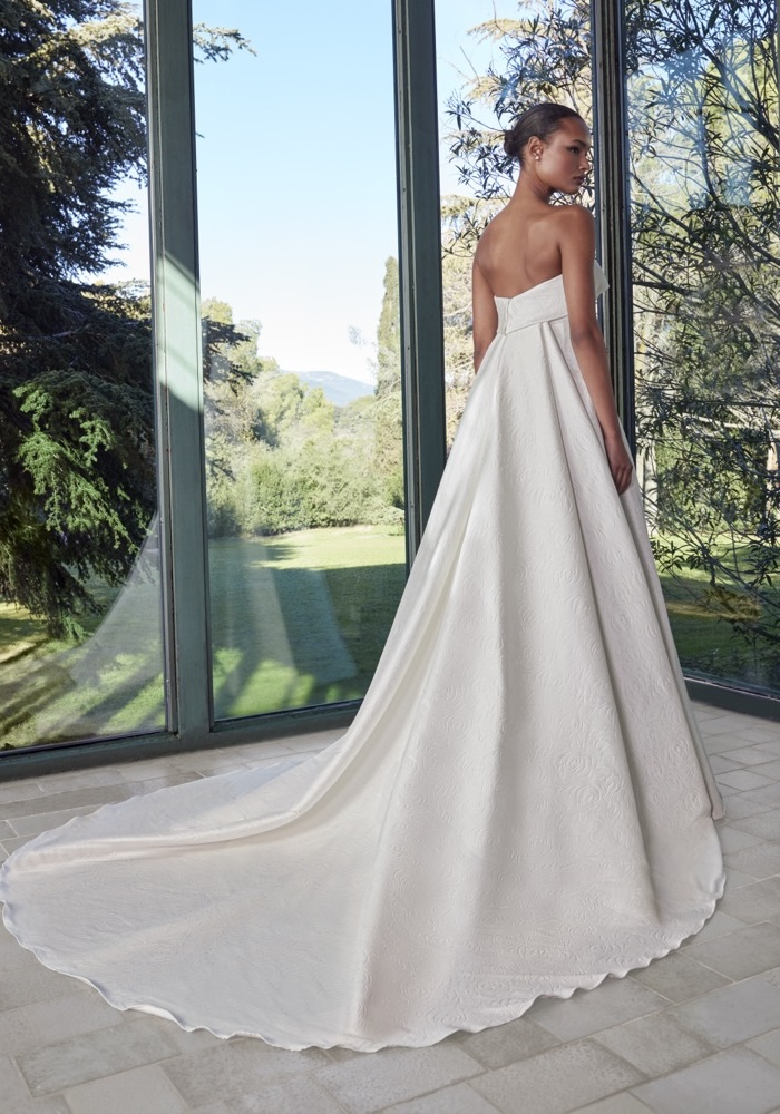 Strapless A-line wedding dress crafted in luxurious mikado with architectural drape and bold structure. Designed for the bride who loves timeless elegance with a powerful, fashion-forward presence.