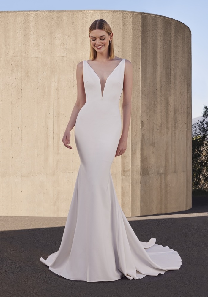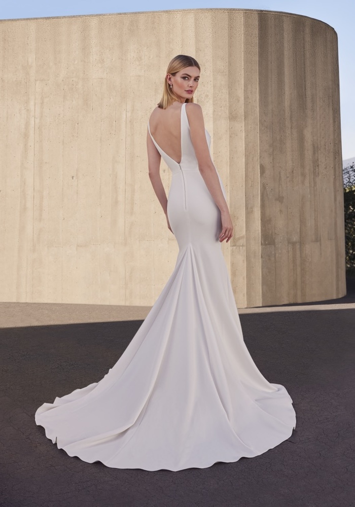 Plunging V-neck mermaid wedding dress crafted in stretch crepe with a low back, offering a minimalist yet stunning aesthetic that highlights modern sophistication.