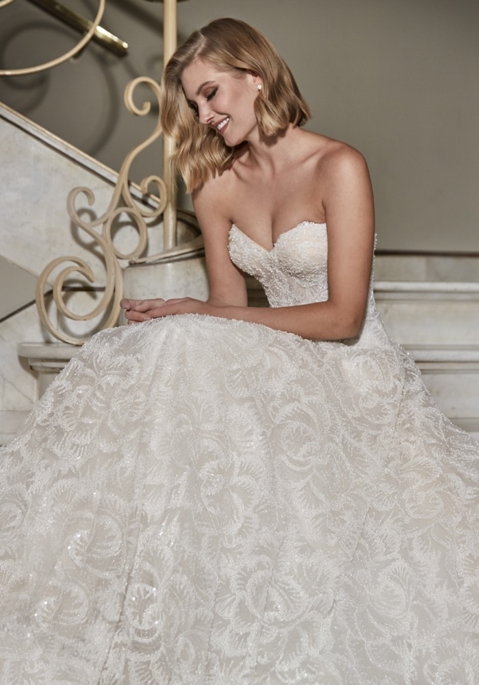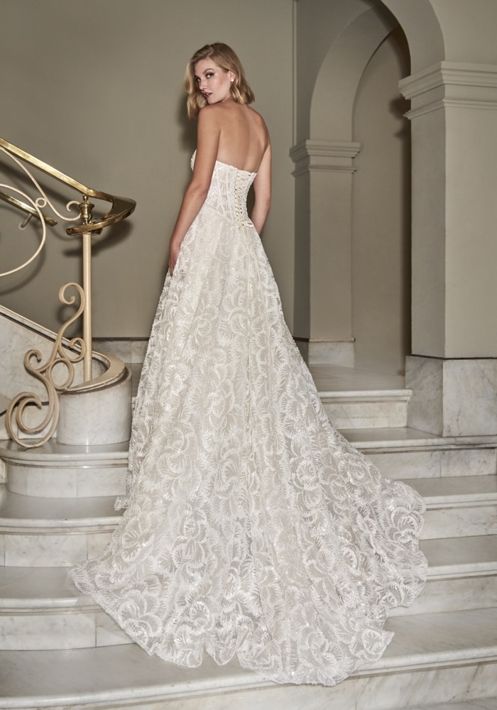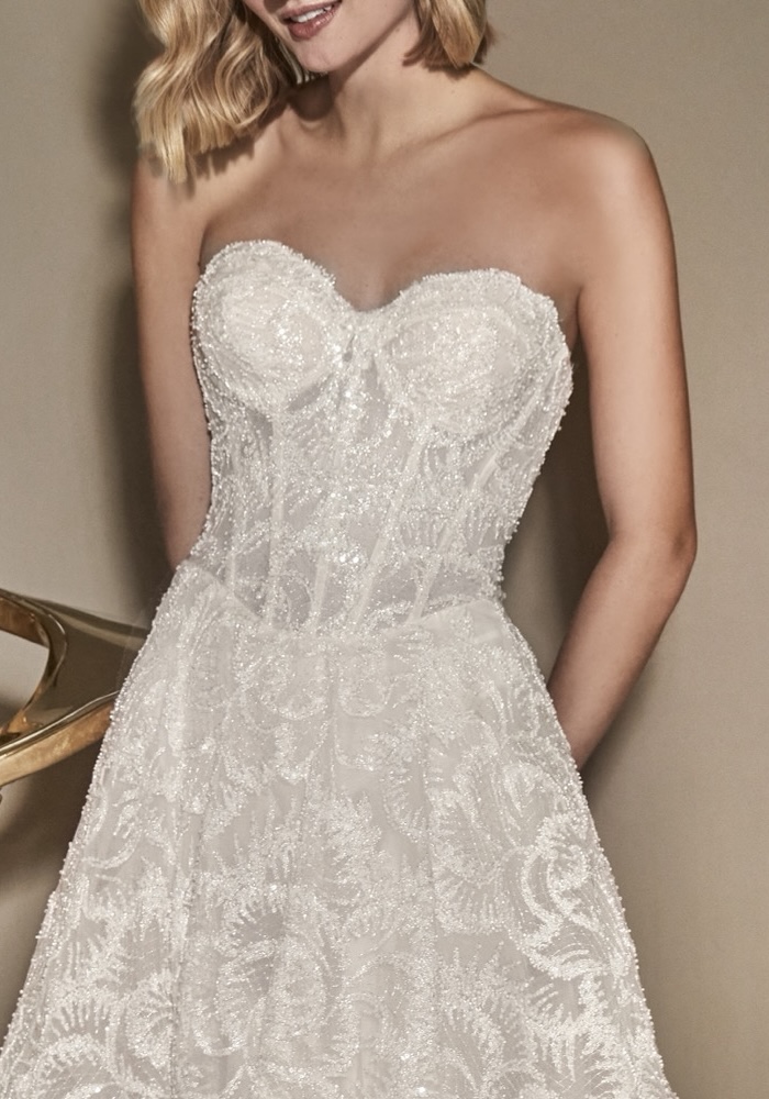 Strapless neckline A-line wedding dress with a sculpting, corset bodice. Intricate lace and beadwork are scattered throughout the entire gown.