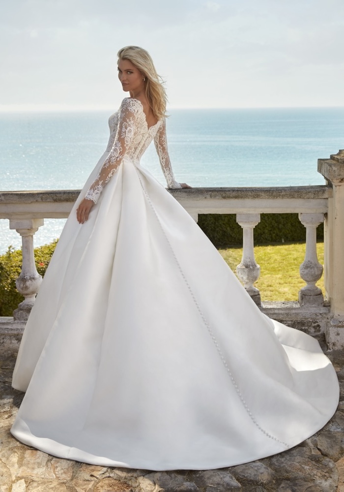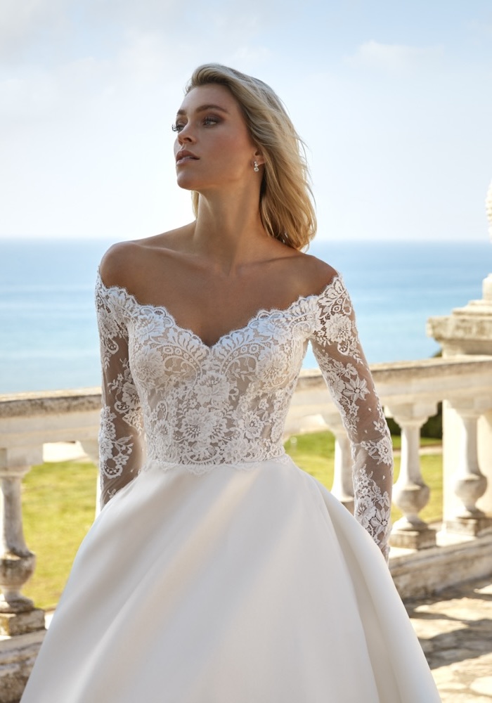 Off-shoulder A-line wedding dress crafted from mikado with a beautiful semi-sheer floral lace bodice and illusion sleeves.