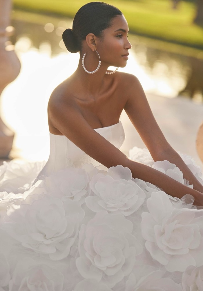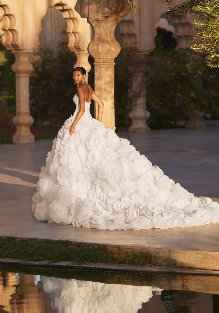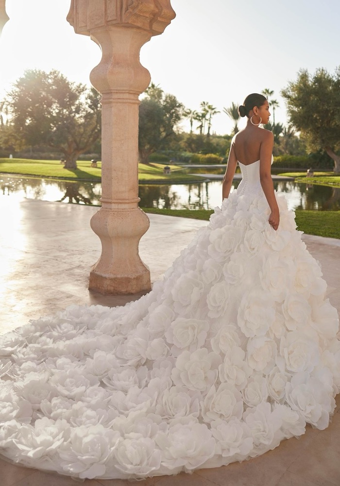 Strapless neckline princess wedding dress with a satin bodice embellished with intricate beaded lace detail. Voluminous skirt made of dreamy organza flowers, featuring a dramatic long train.