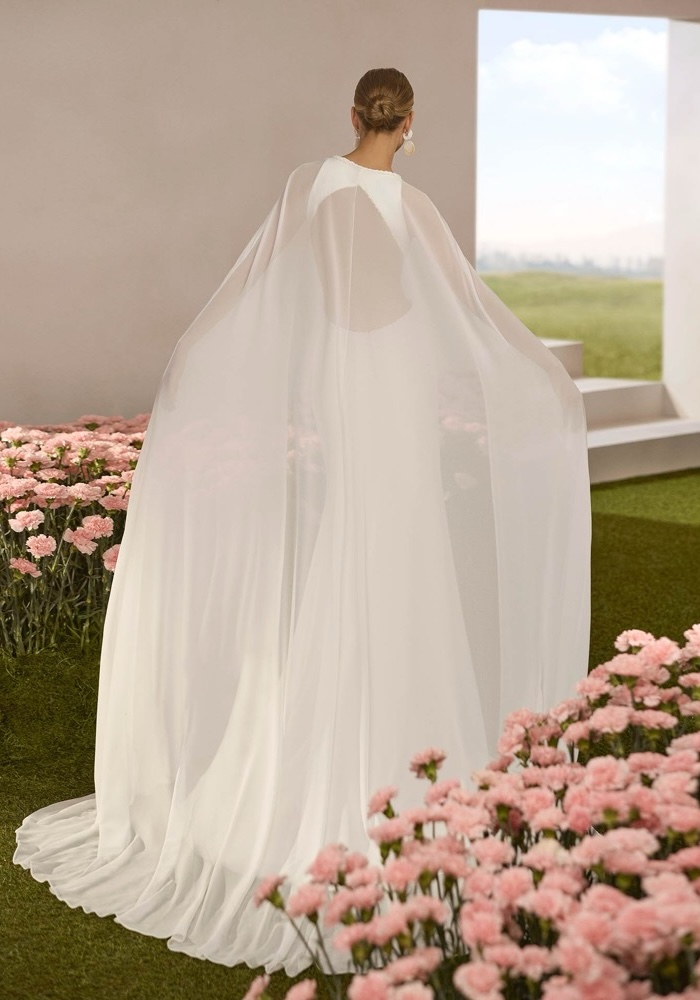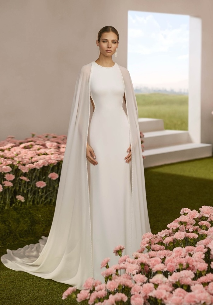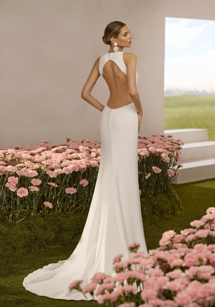 Crew neck mermaid wedding dress crafted from stretch crepe, featuring intricate braid detail along the neckline and keyhole back.
