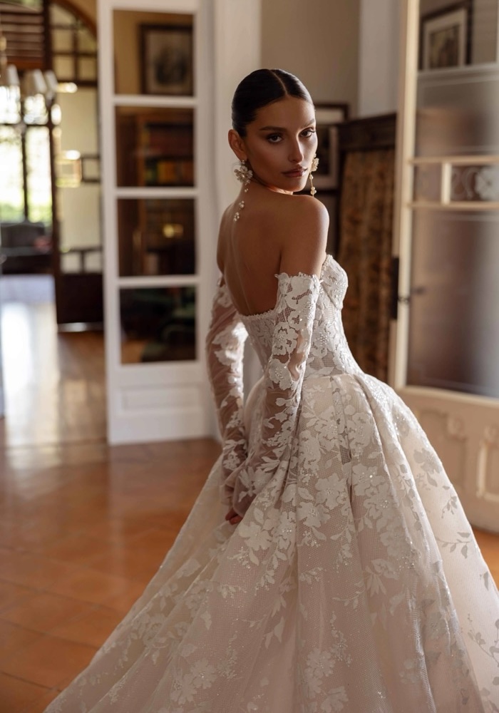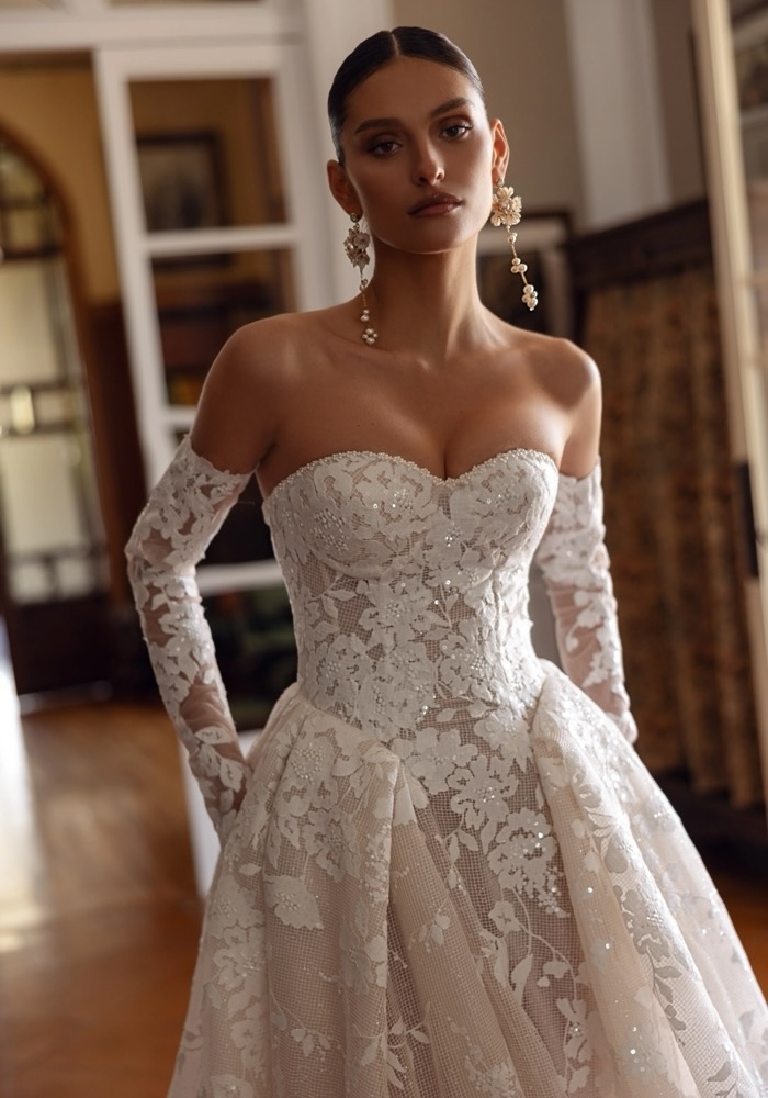 Crafted from shimmering glitter tulle, this strapless princess wedding dress is a vision of romance. The sculpted corset bodice provides a flawless fit, beautifully adorned with cascading lace and intricate beading that catches the light with every step.