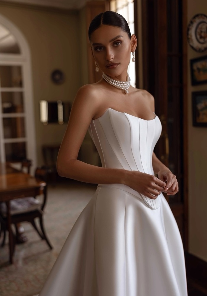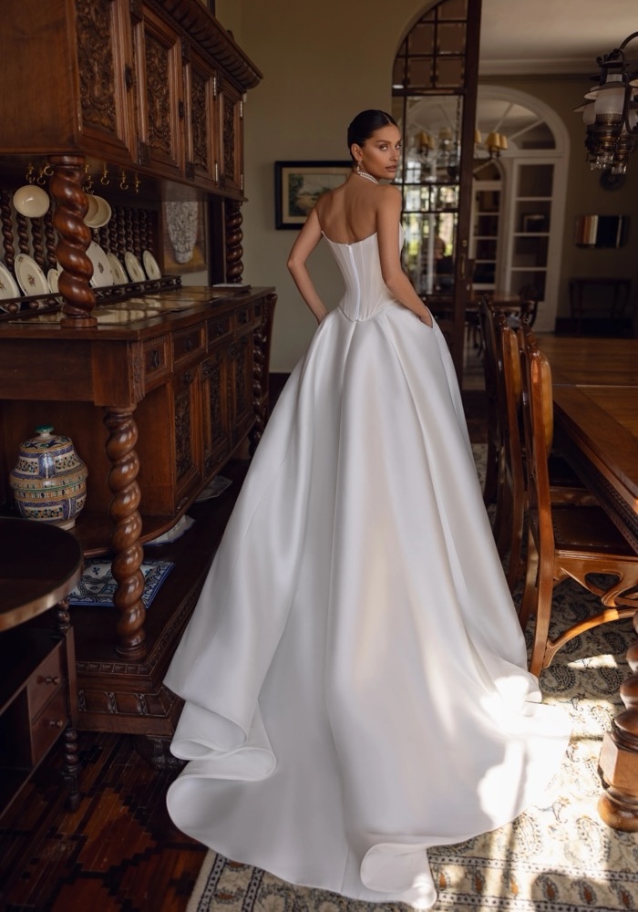 Defined by its clean lines and sophisticated structure, this strapless A-line wedding gown is crafted from mikado for a refined finish. The sculpted corset bodice offers a flawless fit, while hidden pockets add a touch of functional charm to the flowing skirt.