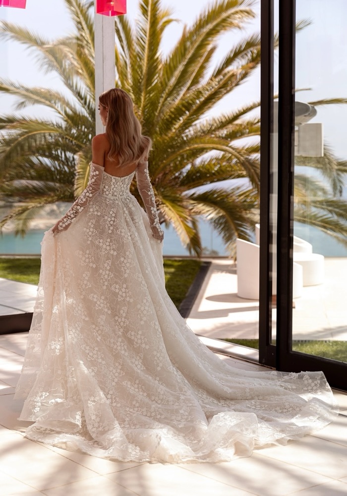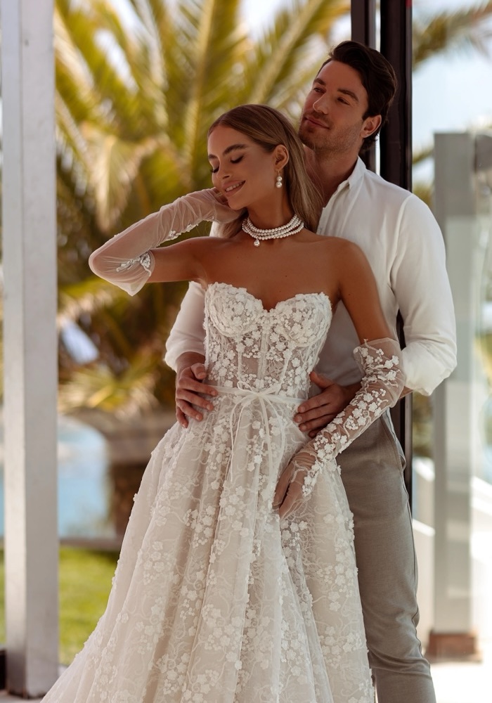 This strapless A-line wedding dress is crafted from Chantilly lace, featuring a semi-sheer corset bodice sprinkled with romantic small flowers throughout the entire gown.