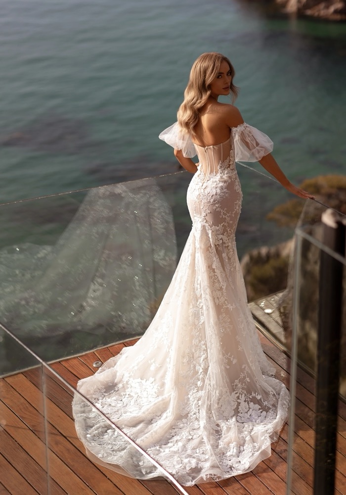 Strapless mermaid wedding dress with a sculpted corset bodice, featuring cascades of intricate beaded floral motifs throughout the entire gown, with a sheer back and removable puffed sleeves.