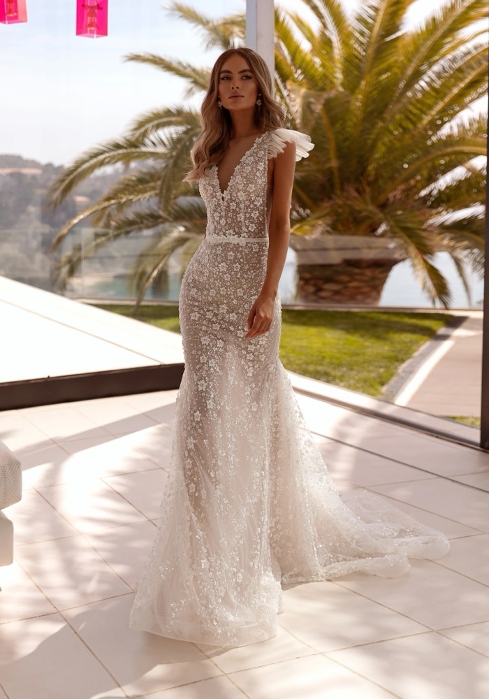 Plunging neckline mermaid wedding dress fully embellished with intricate beads, pearls and sequins throughout the entire gown with a low back. The ruffle cap sleeves extend like wings—adding a touch of whimsy.