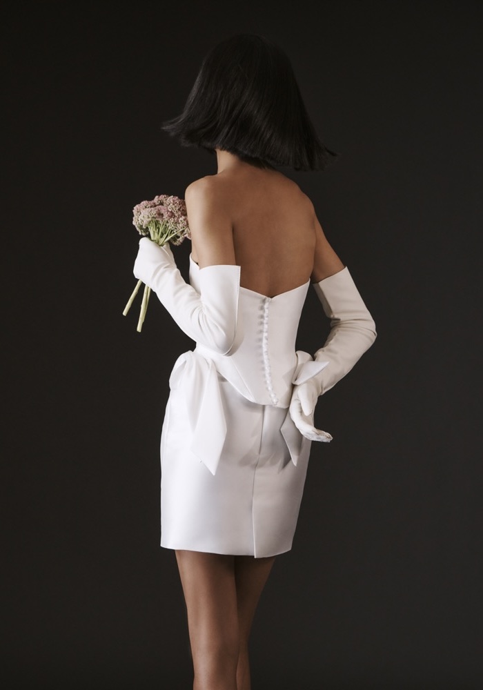Sweetheart neckline short wedding dress crafted in mikado with a sculpted, boned bodice for a striking silhouette. Personalise your look for the ceremony with the elegant detachable overskirt.