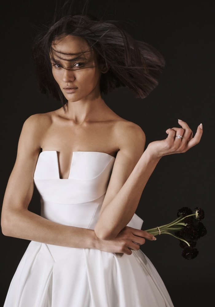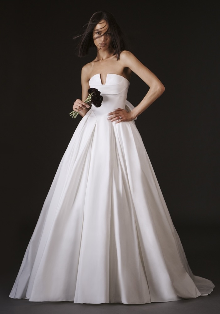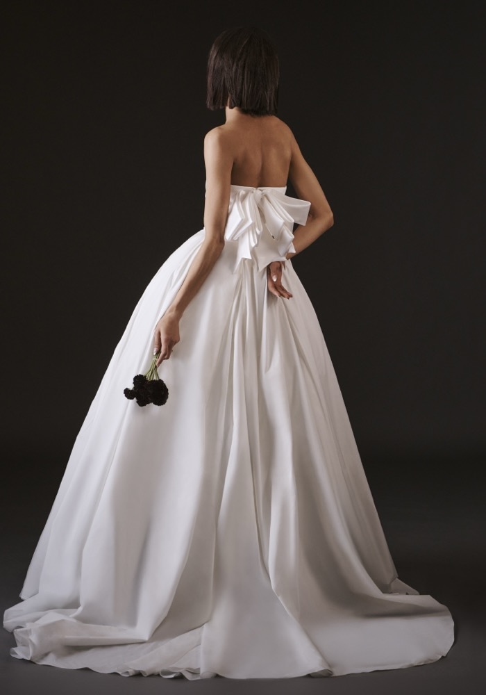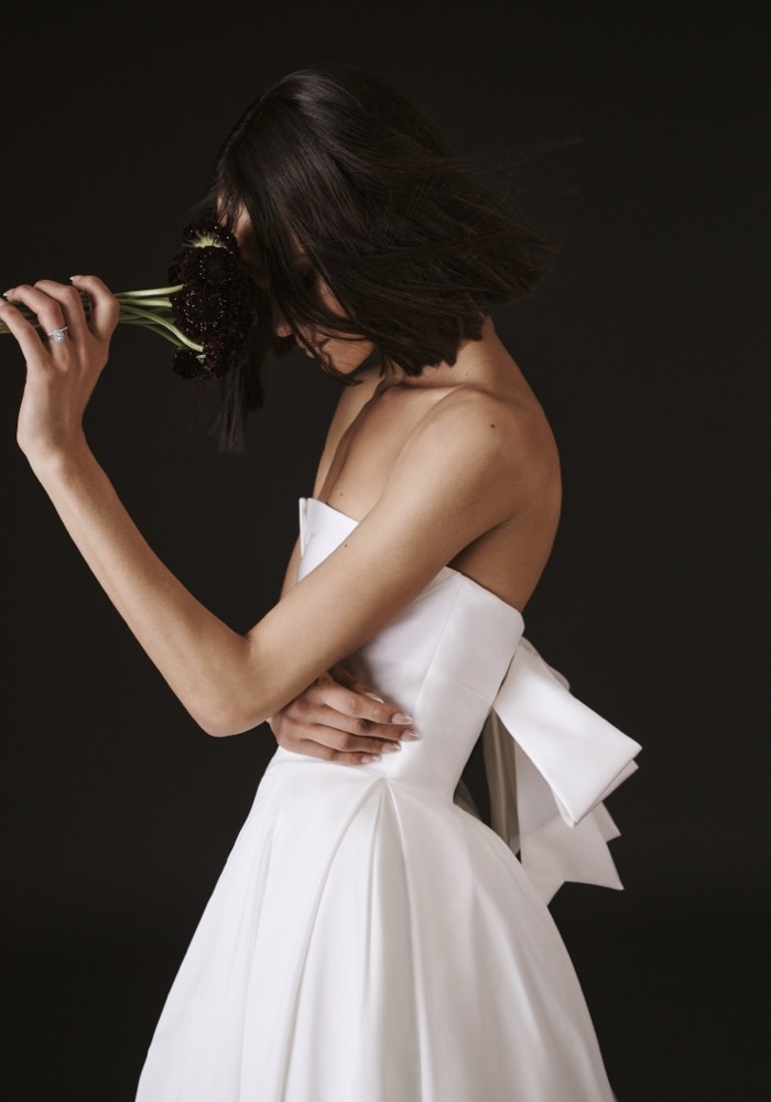 A strapless princess wedding dress in mikado silk features a sculpted bodice and a pleated skirt, accented by a dramatic back bow for a modern, elegant bridal look.