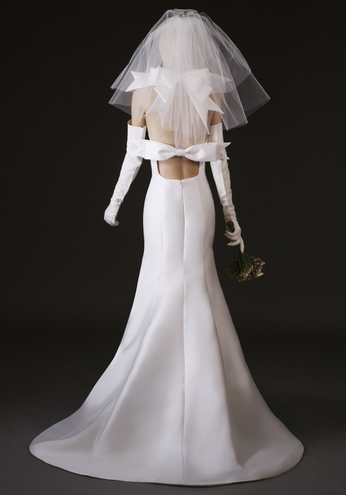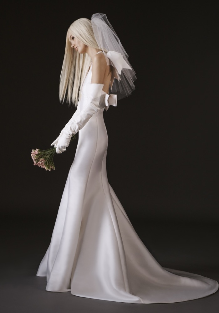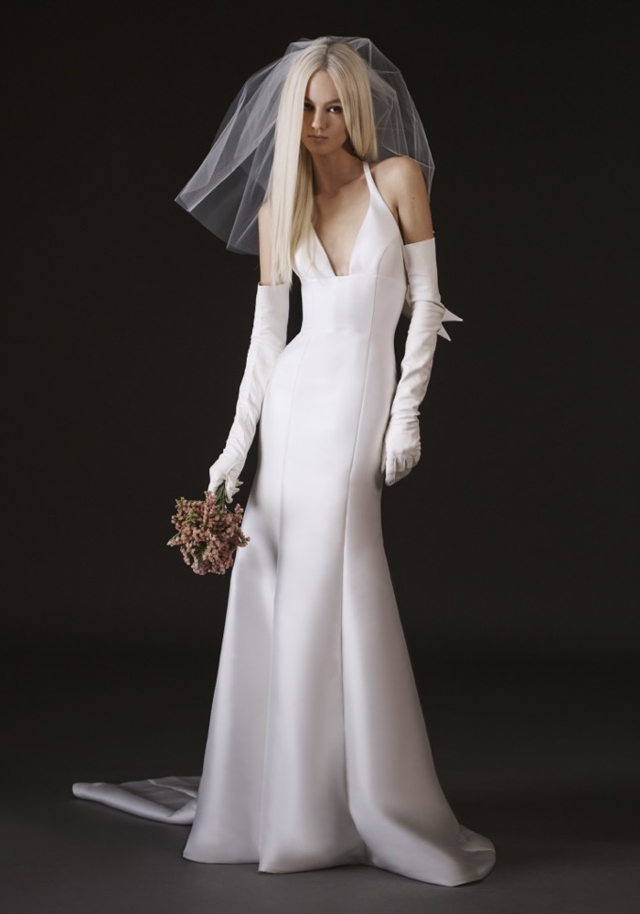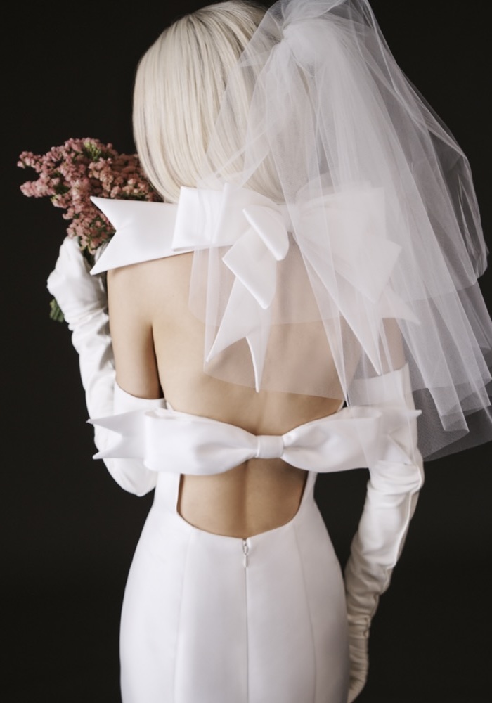 Halter neckline mermaid wedding dress crafted from mikado with signature bows at the back that adds a sophisticated, feminine touch.
